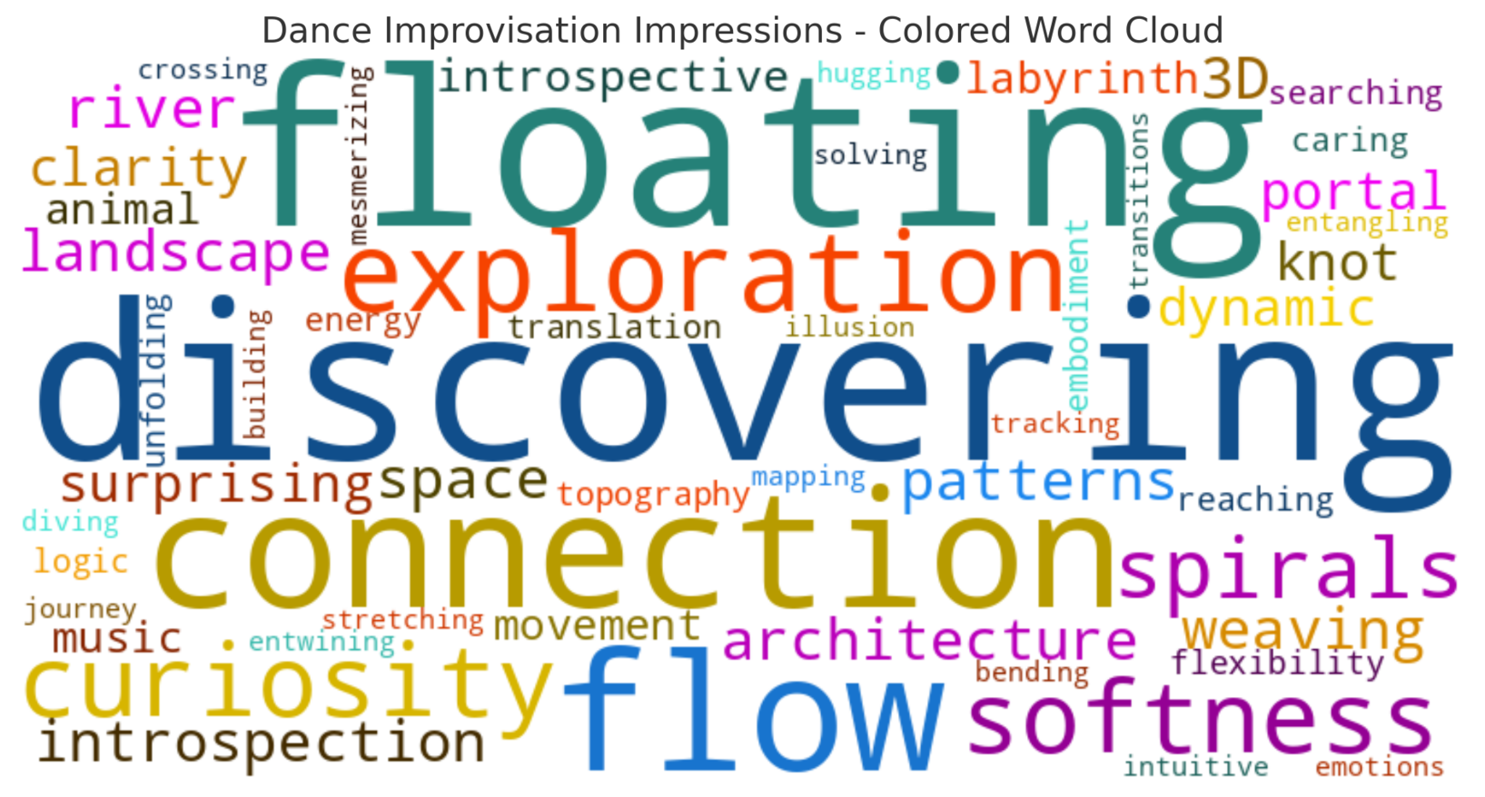 - Many of the responses include metaphors or descriptions that evoke complex, layered experiences of the body. Words like “labyrinth,” “threads,” and “spirals” illustrate the dancer’s constant navigation between different movement pathways. This speaks to the multidimensional aspect of movement in the improvisation process, where the body’s journey is as much about discovery as it is about expression.
