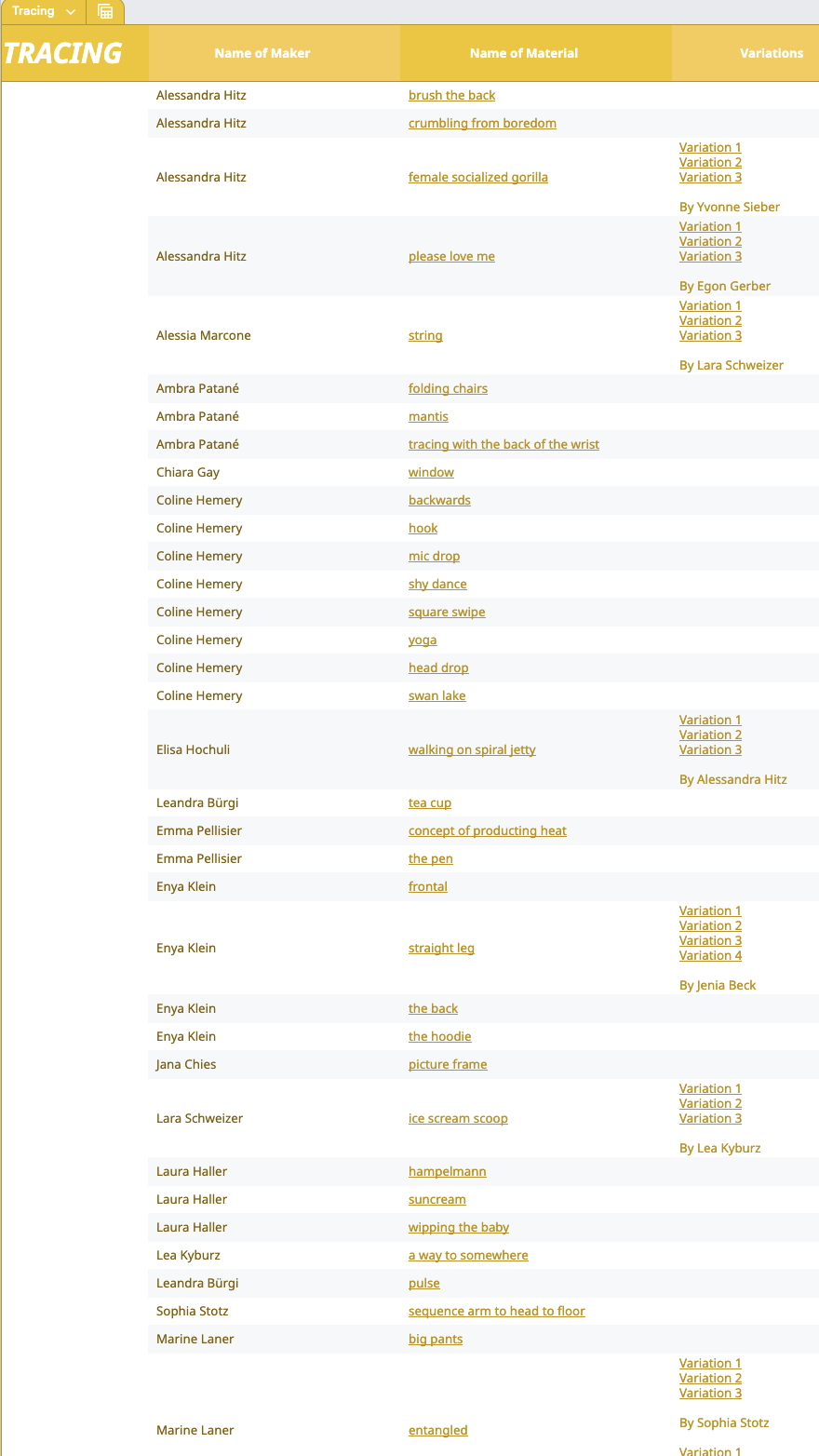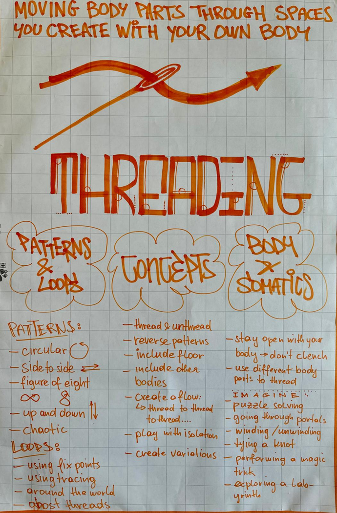 - verbal or written exchange of thoughts, experiences and ideas- - laboratory formats to create and name patterns, phrases and other repertory-additional exercises to integrate the repertory into the individual spectrum of movement and to take the created material further