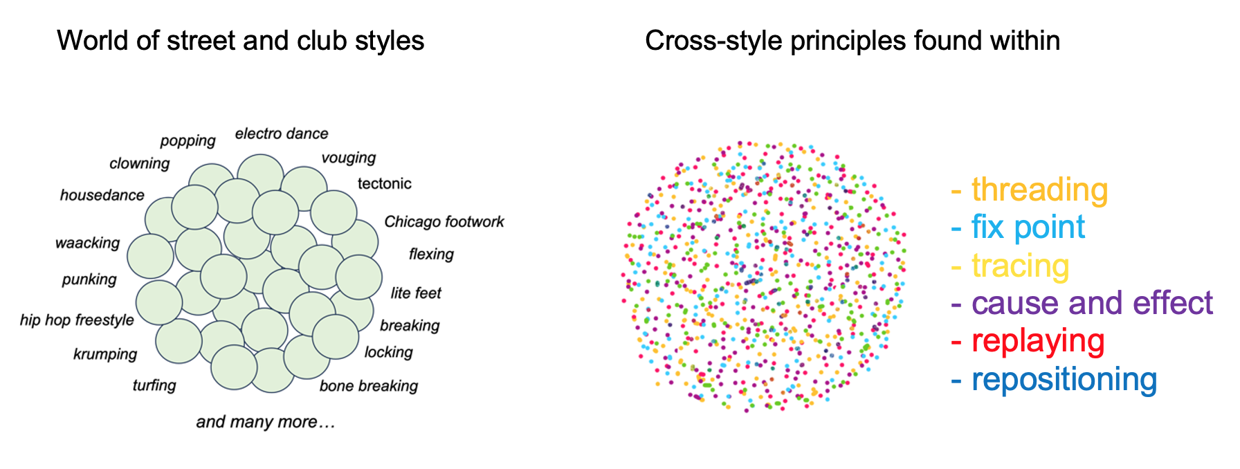 Cross-style principles represent simple and tangible ideas and are infused by meta-aesthetics, such as illusion, isolation, manipulation or animation. They exist mainly as embodied knowledge and, as such, are widespread throughout the worldwide community. Having been involved in the world of street and club styles since 2004 (mainly through the styles of breaking and popping), I gained awareness of their presence and embodiment over time. It has been a slow but exciting journey since –their discovery this still ongoing and finds a first academic outcome through this exposition in May 2025.