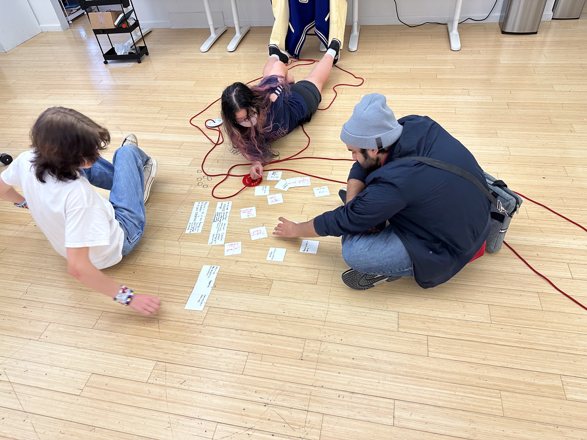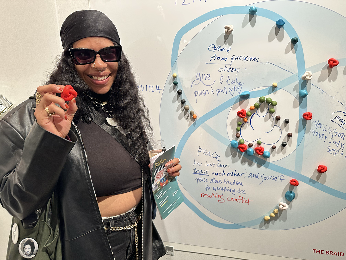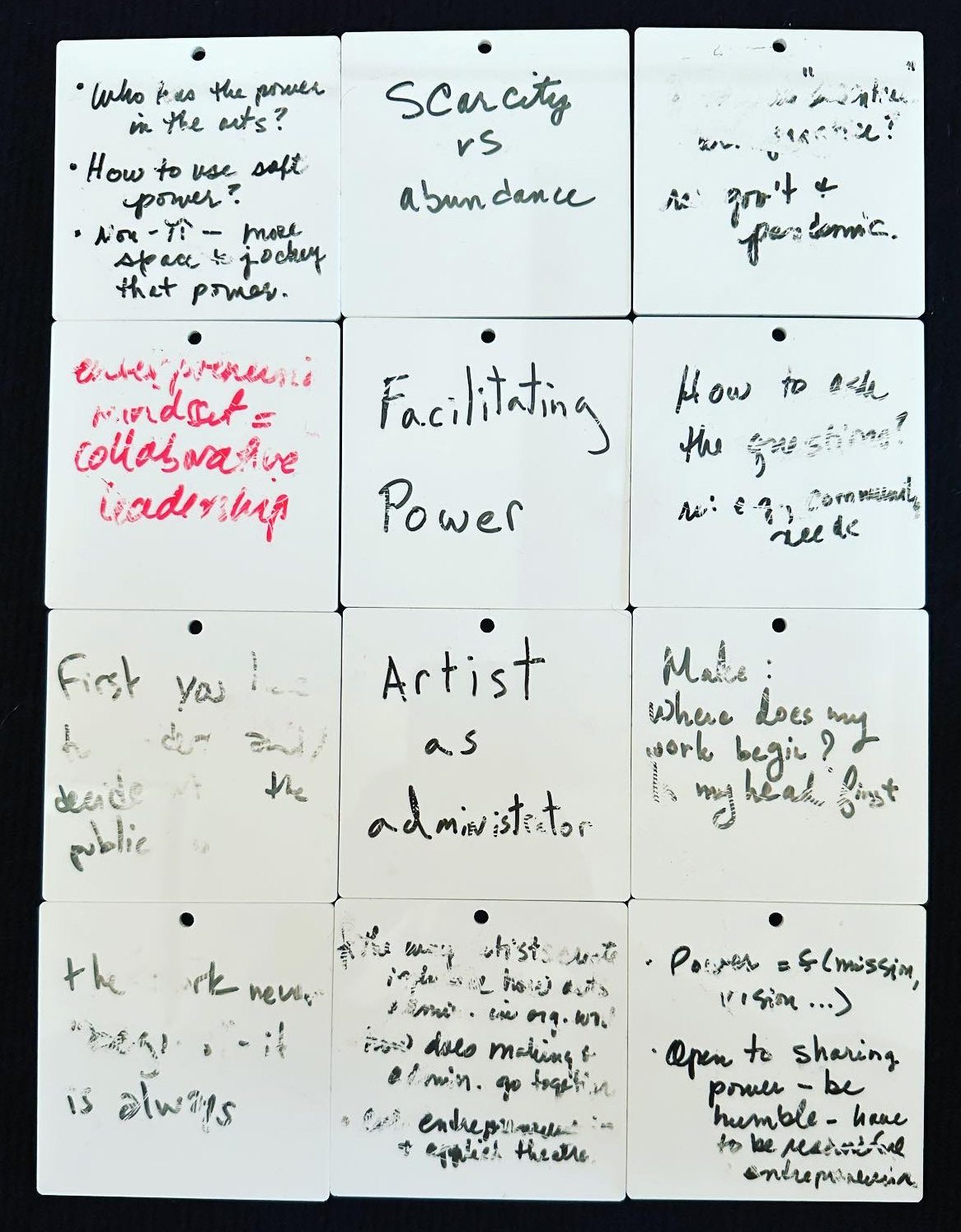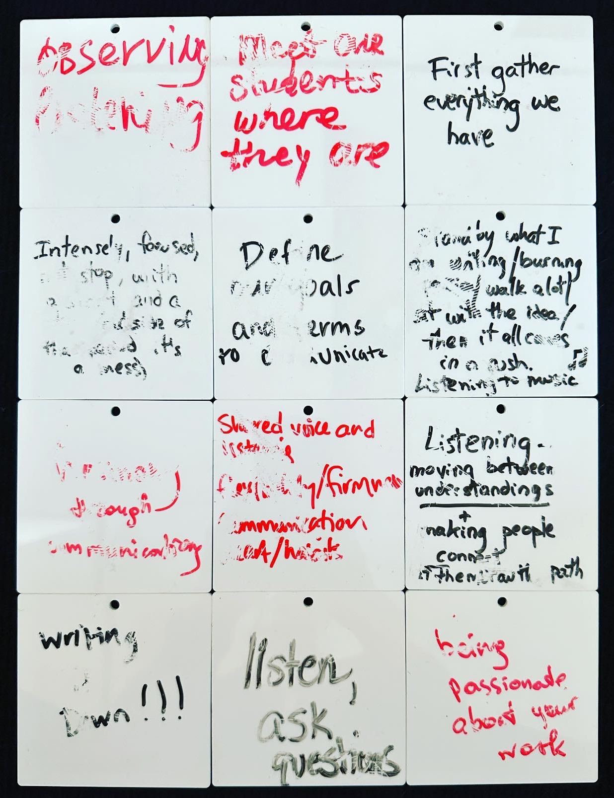 The workshop at New York Arts Program was an opportunity to use The Braid to initate co-writing. After students validated their experiences with their practices in conversation, they detached the note tiles and in their groups ordered them into a shared narrative. That served as an opportunity for reflection, and as a step towards personal writing.