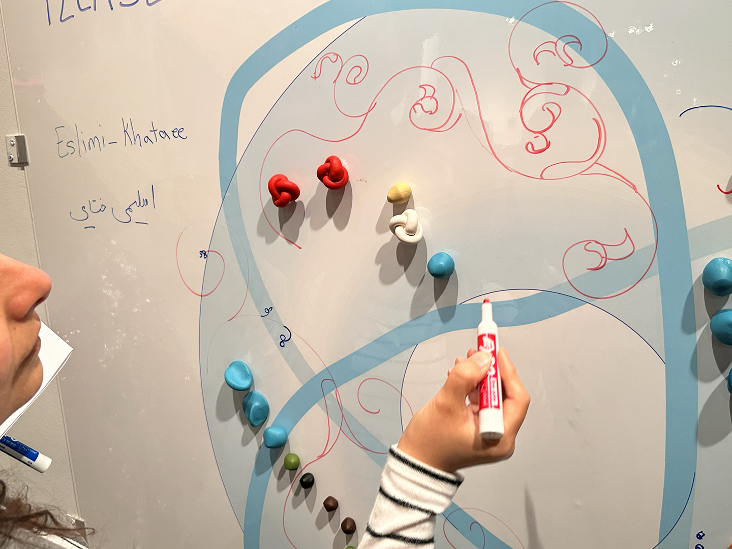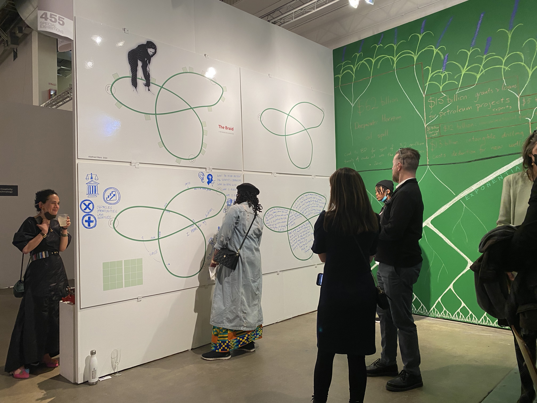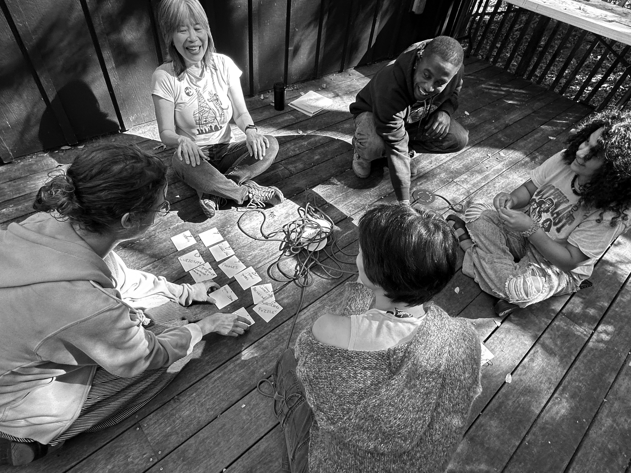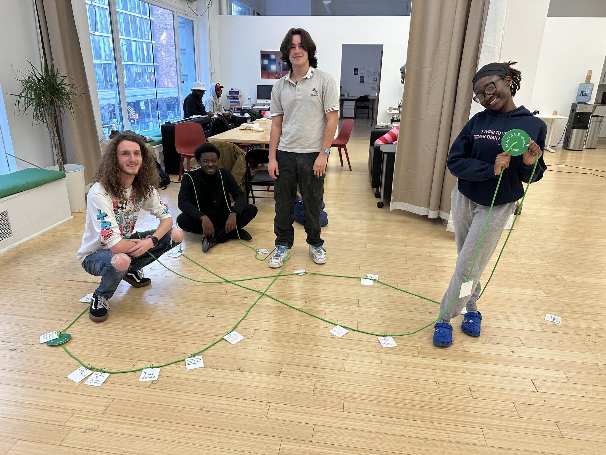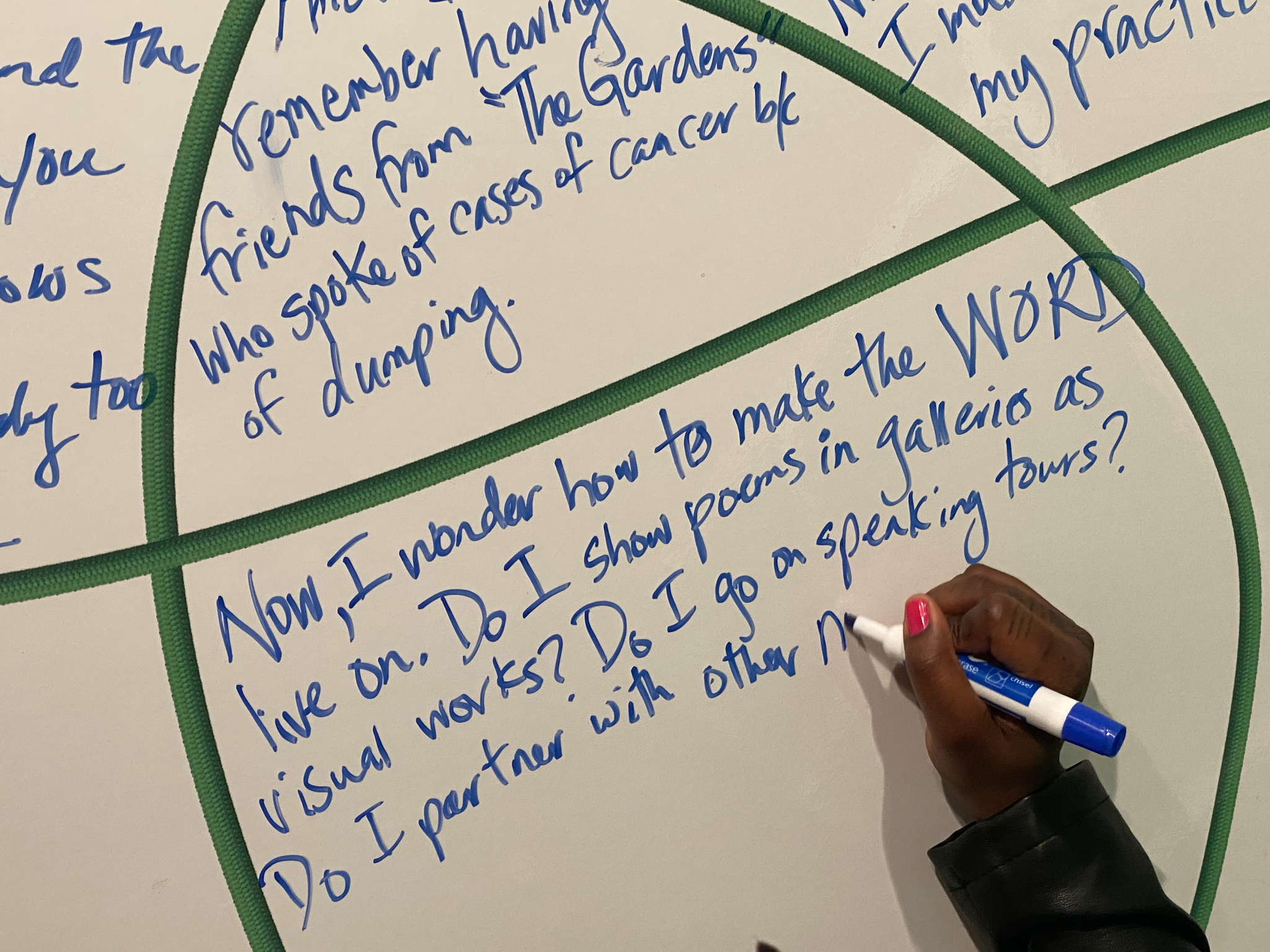 The workshop at New York Arts Program was an opportunity to use The Braid to initate co-writing. After students validated their experiences with their practices in conversation, they detached the note tiles and in their groups ordered them into a shared narrative. That served as an opportunity for reflection, and as a step towards personal writing.