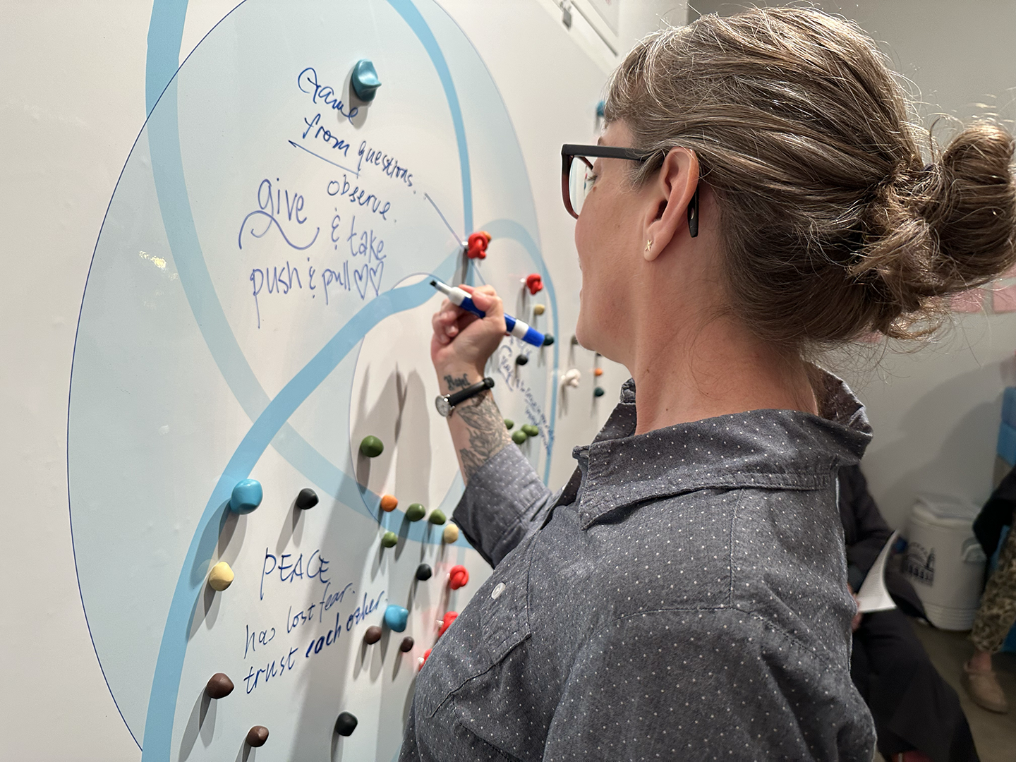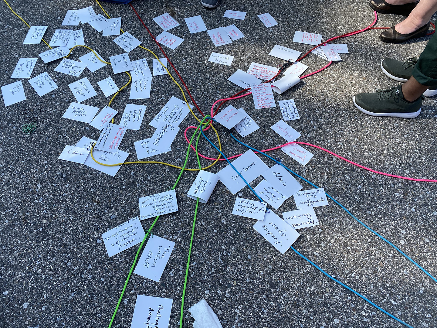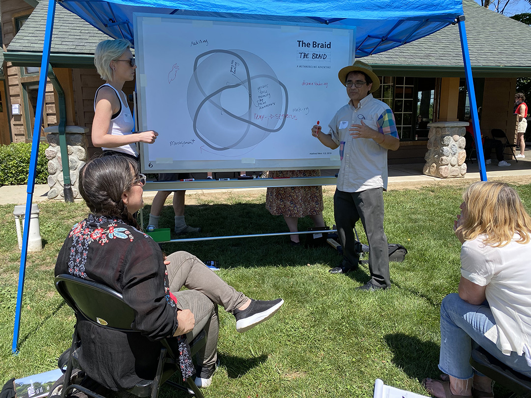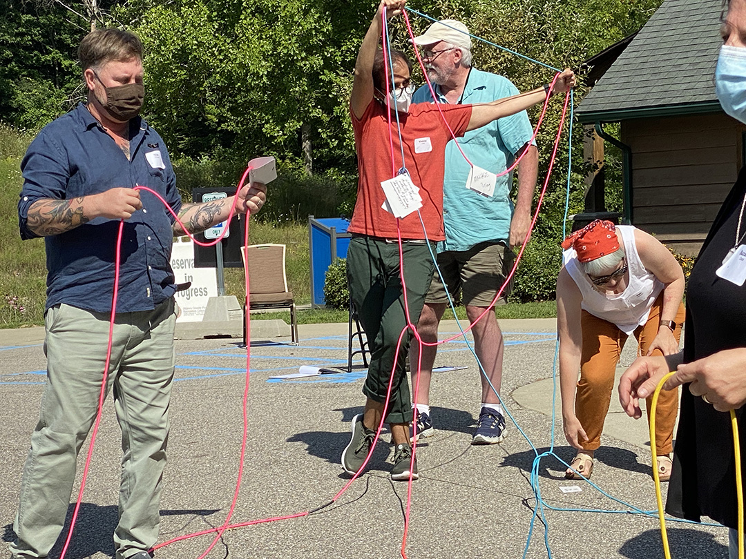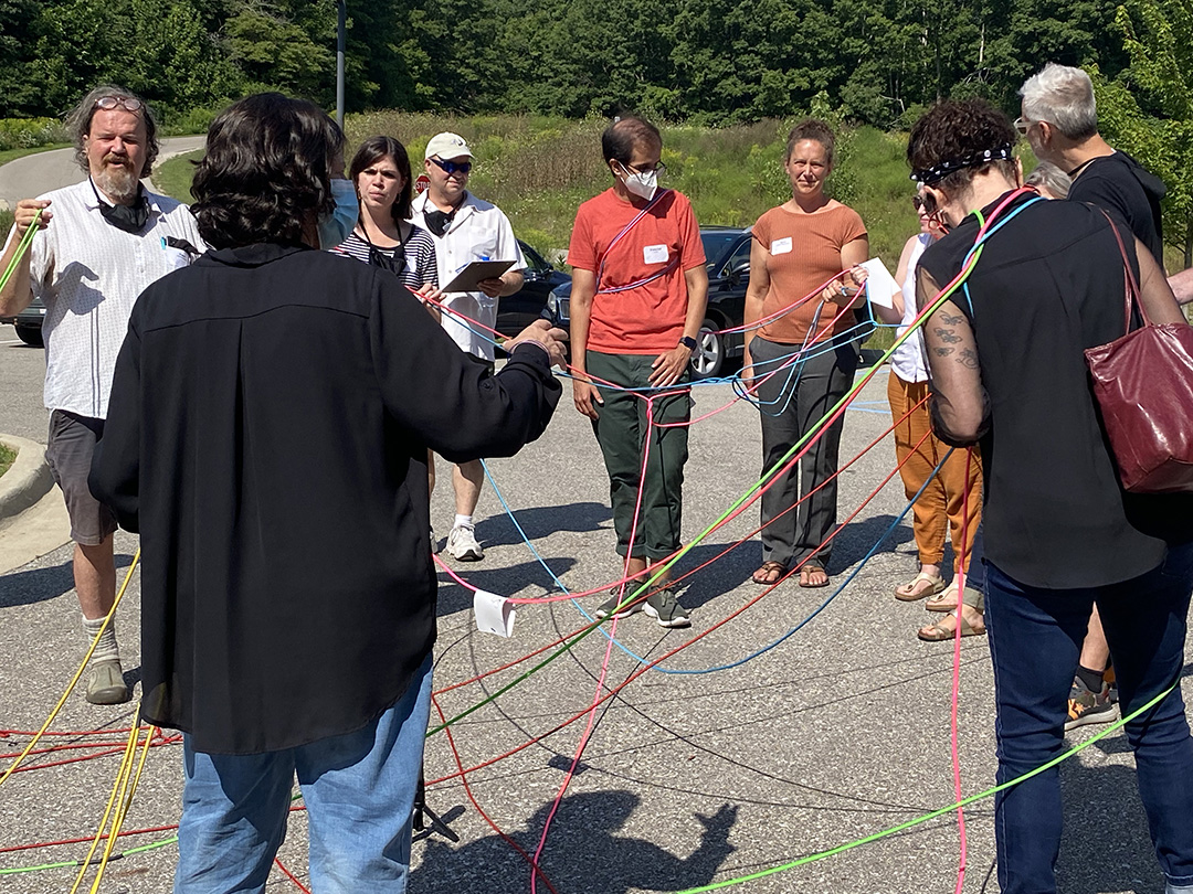Over two days in August, I facilitated a retreat at Grand Ravines Park in Michigan, for the Visual and Media Arts Department of Grand Valley State University. Faculty, staff and alumni participated. Invited and supported by department chair Paul Wittenbraker, I worked closely with Jenn Schaub, an alum of the program and the Director of Community Building & Engagement at the Dwelling Place of Grand Rapids. Goals were bringing everyone together after the pandemic and following a reorganization, to assess and reconnect, visioning future scenarios. Starting with Braid diagram supported conversations about participants’ own, creative practices, we moved on to using String Braids in reflecting on each area’s curriculum and pedagogy, followed by exploring connecting narratives that can collectively move forward the aeas of Art History, Art Education, Visual Studies, and multiple specialties in Fine Arts, Design and Production. A concluding report was submitted shortly after.