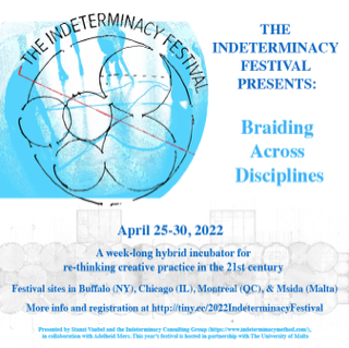 Since 2016, Stanzi Vaubel has directed the annual Indeterminacy Festival, offering curated, arts-based laboratories that challenge participants to connect across disciplinary expertise. The 2022 iteration of the Indeterminacy Festival: Re-Disciplining in the 21st Century is being created in collaboration with Adelheid Mers, using The Braid, a multi-dimensional facilitation instrument Mers has developed, as a point of departure. Our goal was to support a line-up of facilitated workshops, each developed from within our contributor’s artistic practices. The Indeterminacy Festival was invited by the School of Performing Arts at the University of Malta. It is taking place there, and at satellite locations in the US and Canada, in April 2022.