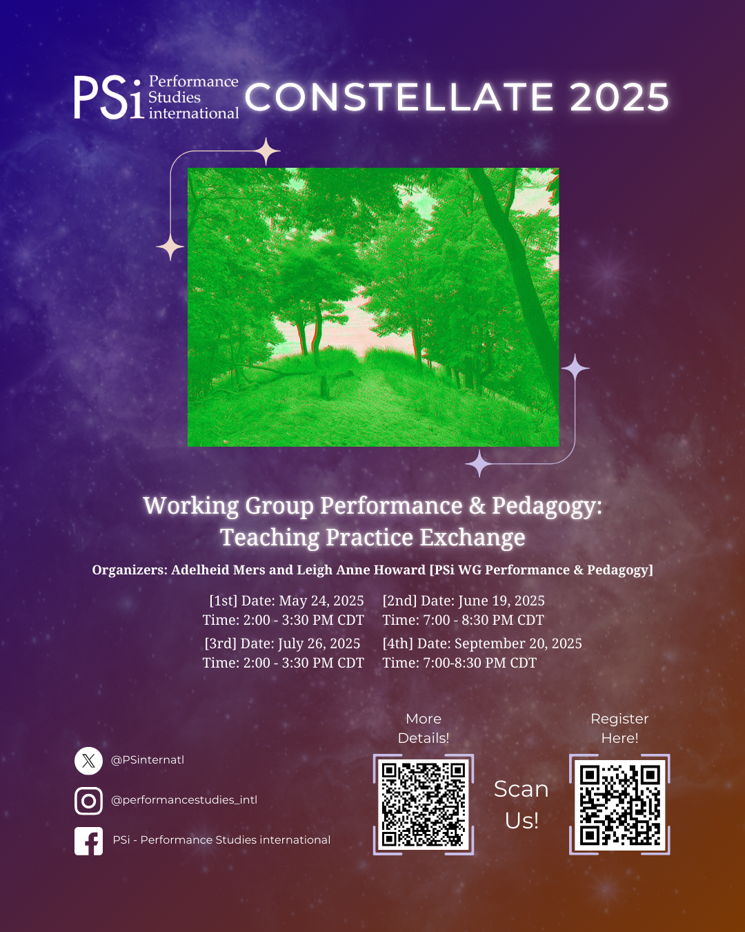 Our last summer date is coming up! The Working Group Performance & Pedagogy offers a forum for sharpening questions, sharing resources, and workshopping models that arise from the PSi membership across multiple dimensions of pedagogy, such as embodied teaching and learning, classroom management, course and curriculum development, and institutional contexts of research and delivery. In advance PSi #30 in Fortaleza, Brazil, 11-15 December 2025, the Working Group invites you to four summer meetings as part of PSi Constellate, offering opportunities for a Teaching Practice Exchange. Follow the QR code, or sign in here. PSi membership is required.