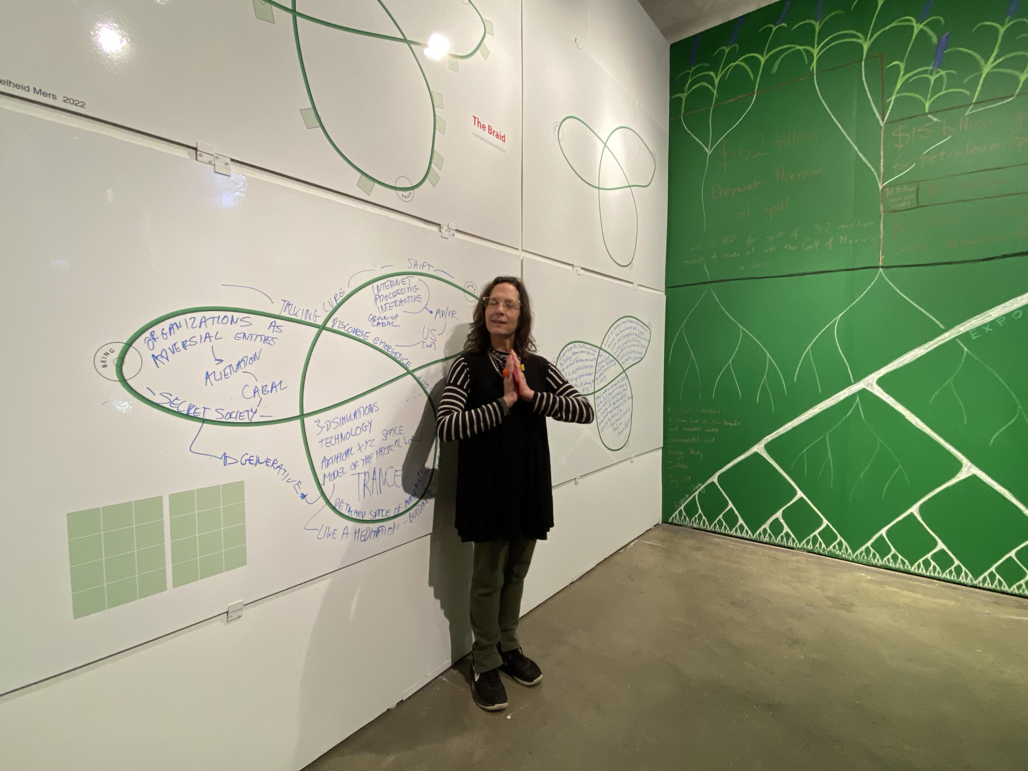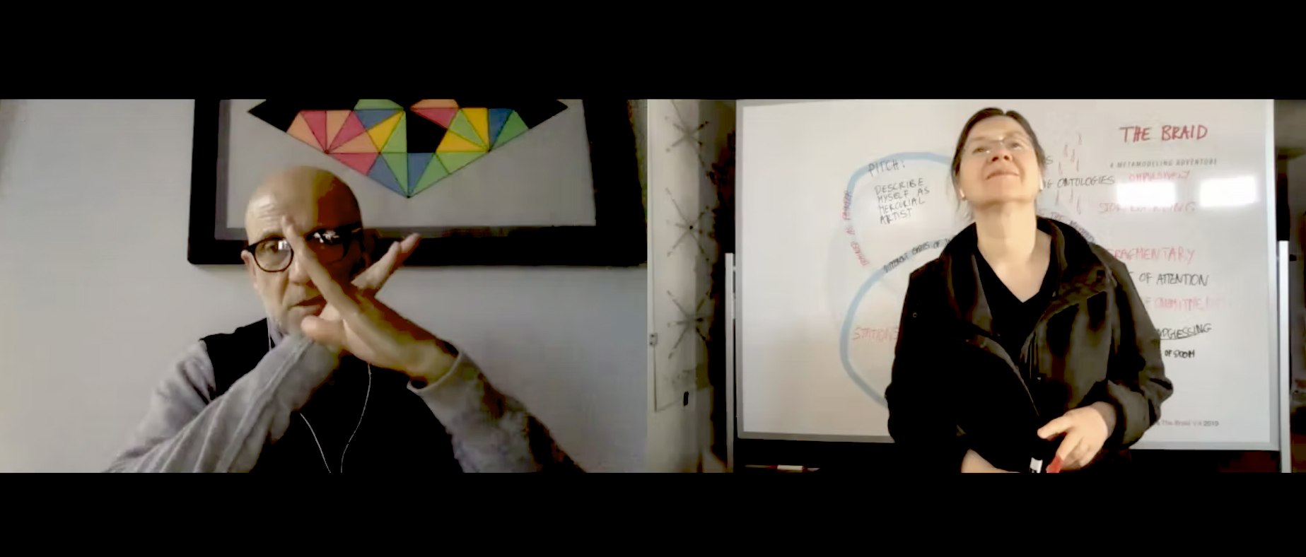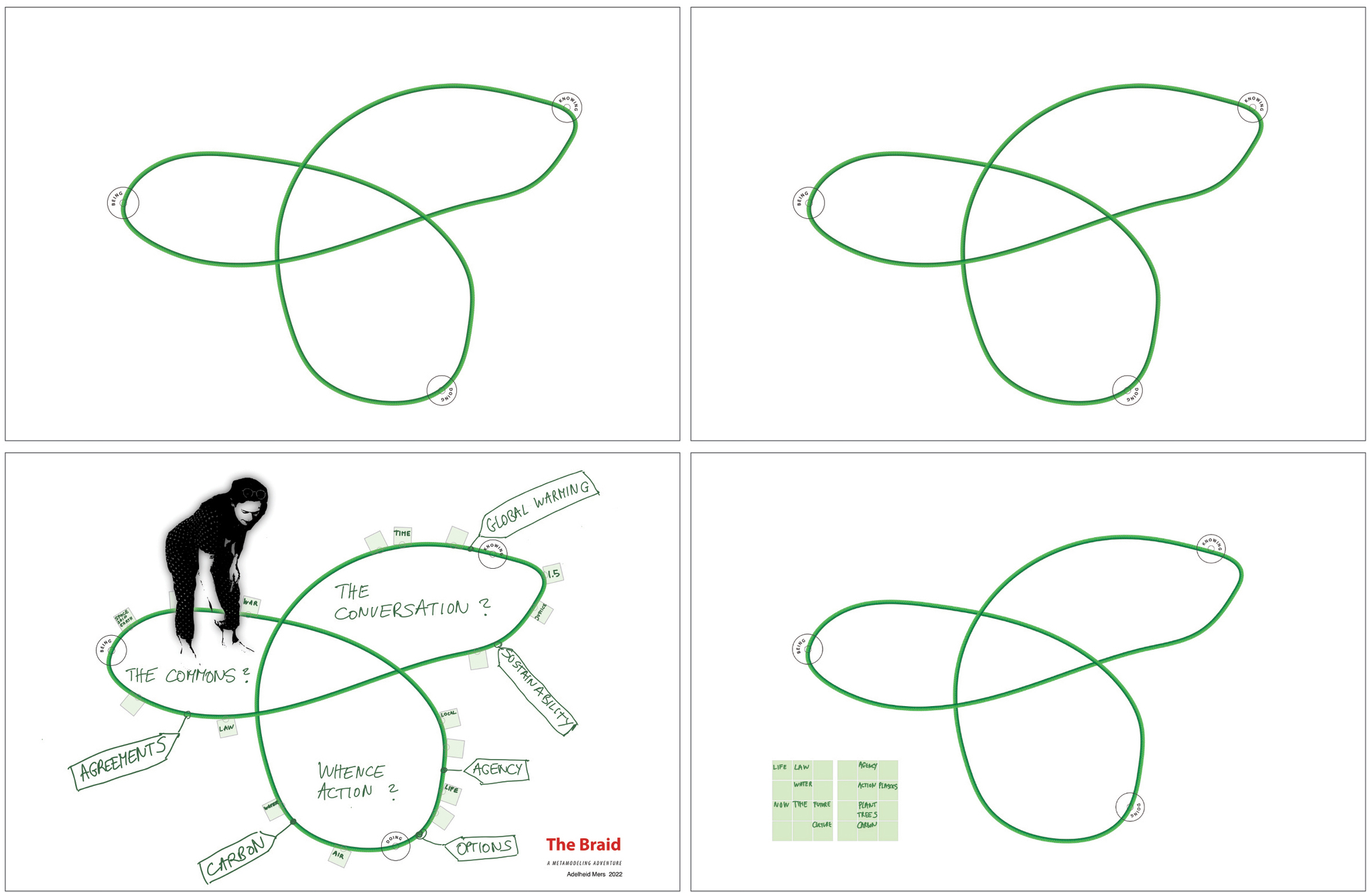 The Braid is a diagrammatic facilitation instrument that emphasizes thinking in space, through an adjacency of embodied and propositional knowing. It was derived from conversations with experimental musicians and other artists about how they work and is often deployed to facilitate conversations about artistic and other practices. Outcomes may be new thinking about practice, and an impetus toward new work, as used for example with Steve Dutton, in the “Articulating Solitudes” pairing reported on during Affinities and Urgencies in Language-based Artistic Research, 2022. Recently, the facilitation process expanded to also yield entries into new writing. The workshop further explores this capacity for collaboratively generating texts from within considerations of the topologies of practice.