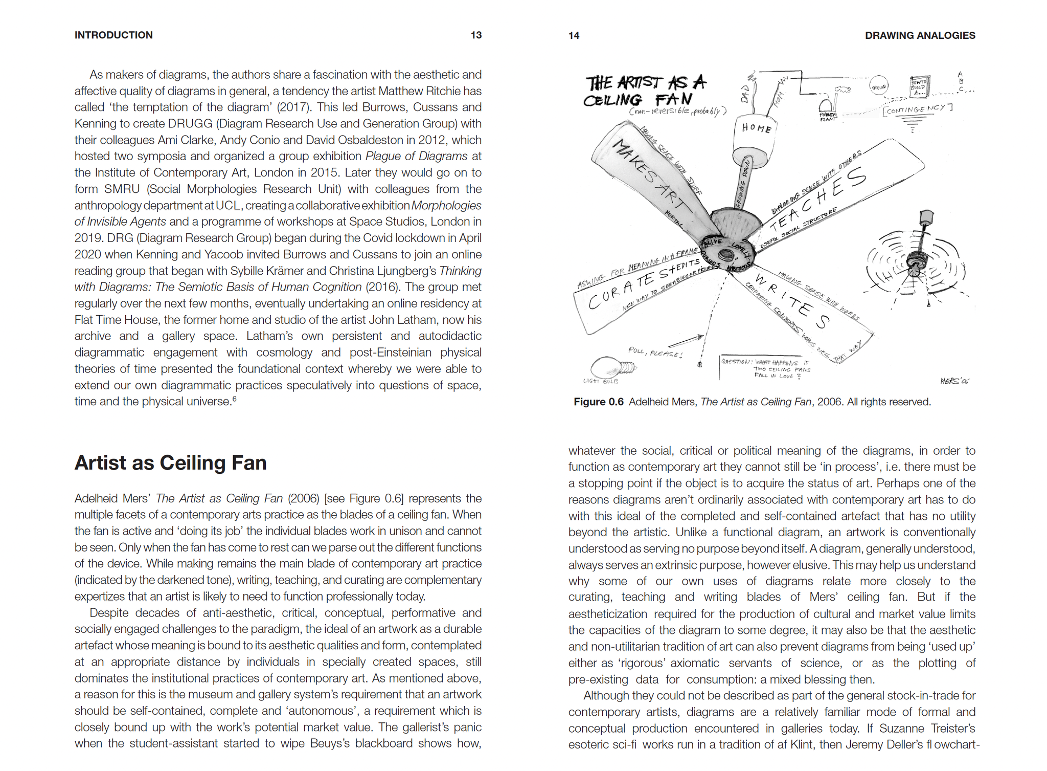 In 2006, I drew The Artist as a Ceiling Fan for an SAIC symposium on artists' roles and identies. In 2025, it was included in the introduction to "Drawing Analogies - Diagrams in Art, Theory and Practice", a book by David Burrows, John Cussans, Dean Kenning, and Mary Yacoob. In 2015, Burrows, Cussans and Kenning had also invited me to be part of their symposium and exhibition, Plague of Diagrams, at the ICA, London. Available Open Access