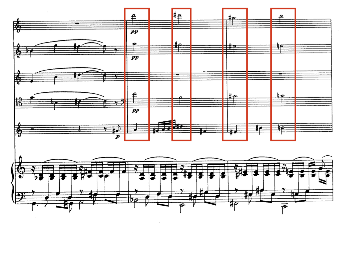 Alternation between very dissonant vertical passages and very horizontal classical melodies.