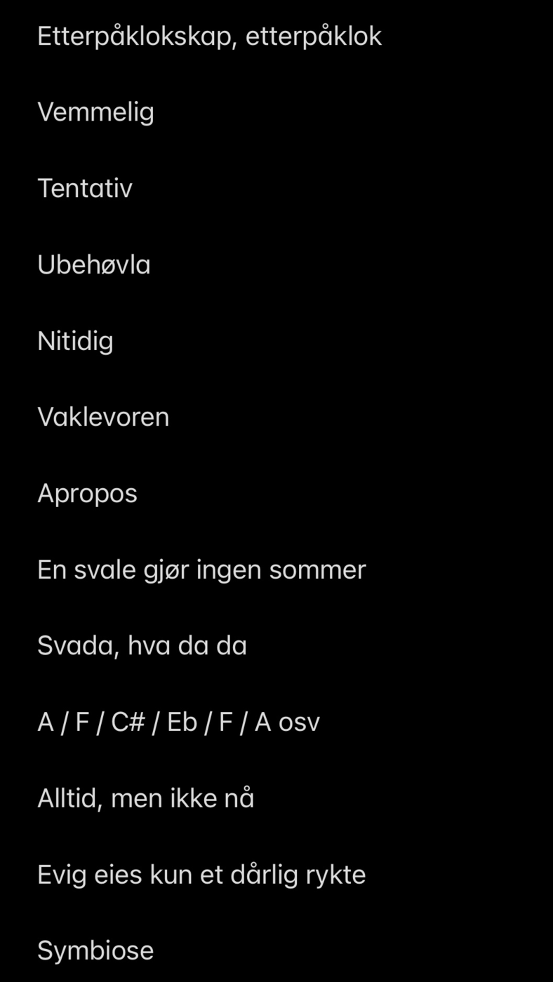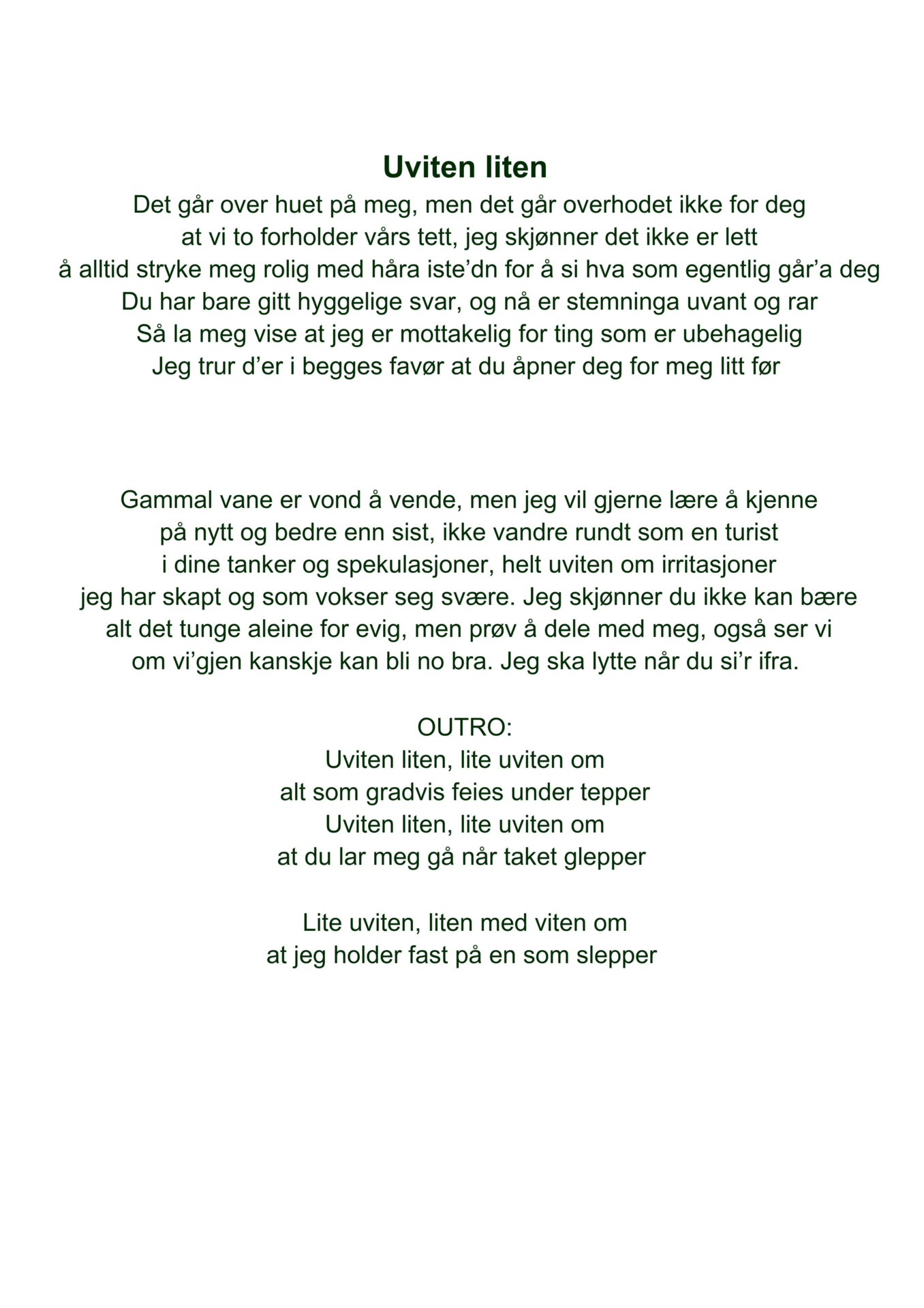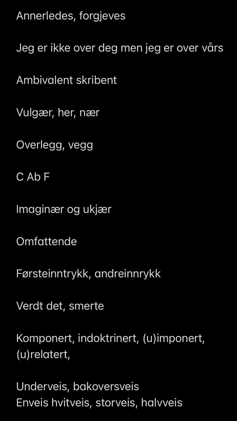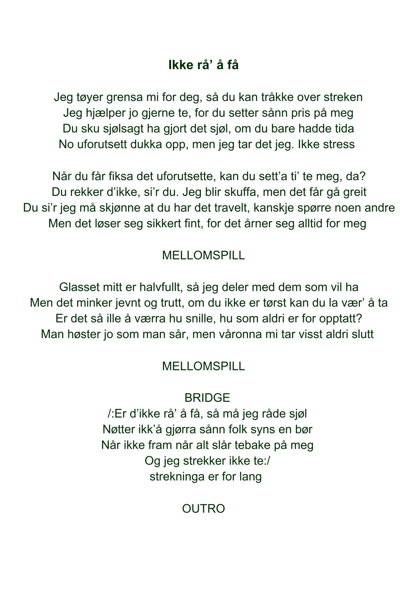 Intrikat og kurant. Kverulere, beleilig fasilitet, våronna og på-sparket-tur. Gammal vane er vond å vende, å se skogen for bare trær, man høster som man sår, og halvfulle glass. Dette er ord og uttrykk fra sangtekstene mine. Originalt har de kanskje dukka opp i en samtale, kanskje jeg har lest de et sted, kanskje har de tilfeldig meldt sin ankomst etter lenge å ha ligget i dvale i underbevisstheten. Fellesnevneren er uansett at jeg har kommet over de og tenkt at det finnes så mange fantastiske ord, uttrykk og metaforer i det norske språket som ikke finner veien inn i sangtekstene fordi de krever stor plass, eller kjennes oppbrukte eller utdaterte ut. De overnevnte orda og uttrykka har vært lagra i et notat på mobilen min, der jeg fortløpende skriver ned nye aktuelle fraser. Her er tre utdrag fra nevnte notat: