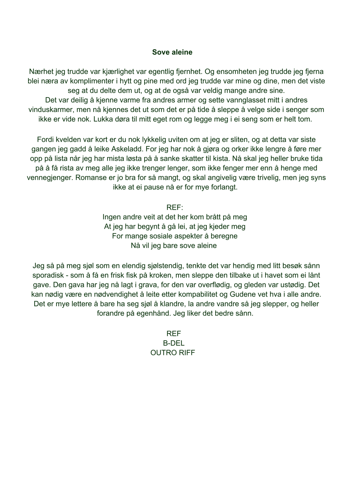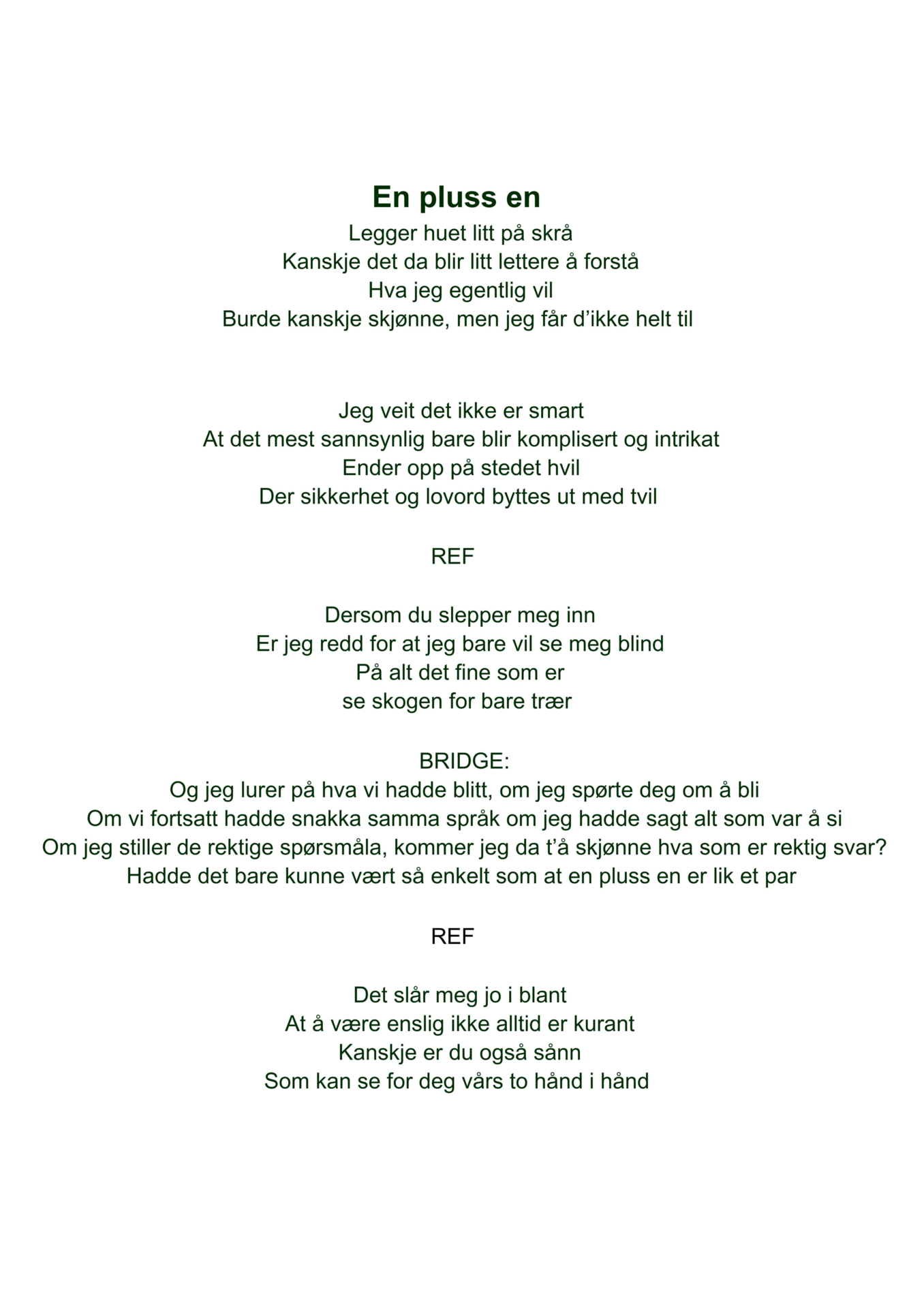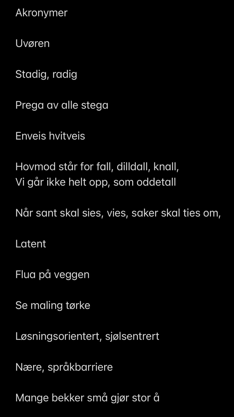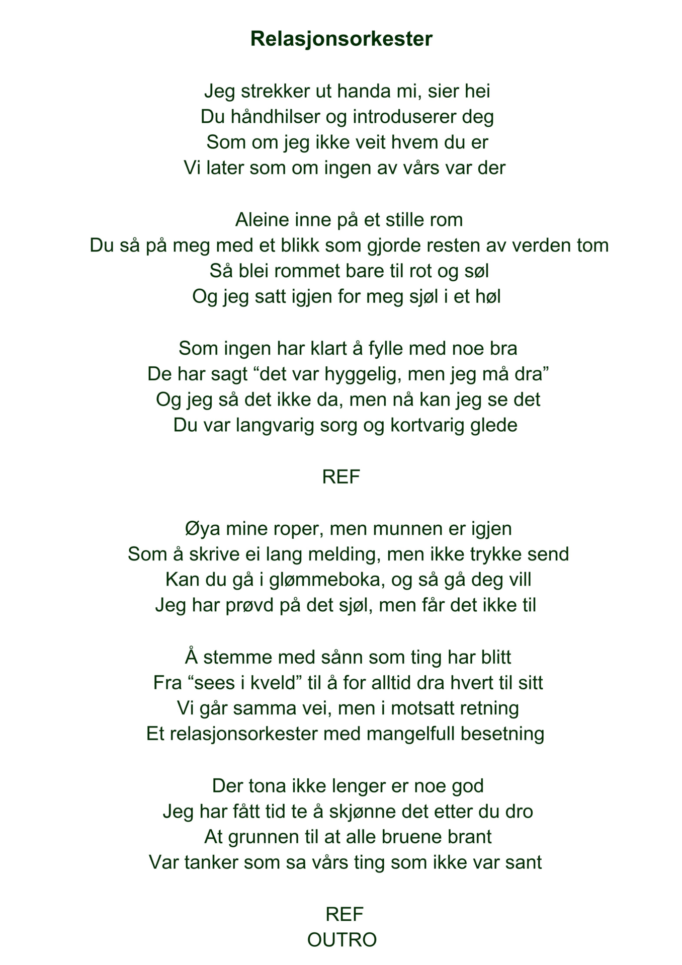 Intrikat og kurant. Kverulere, beleilig fasilitet, våronna og på-sparket-tur. Gammal vane er vond å vende, å se skogen for bare trær, man høster som man sår, og halvfulle glass. Dette er ord og uttrykk fra sangtekstene mine. Originalt har de kanskje dukka opp i en samtale, kanskje jeg har lest de et sted, kanskje har de tilfeldig meldt sin ankomst etter lenge å ha ligget i dvale i underbevisstheten. Fellesnevneren er uansett at jeg har kommet over de og tenkt at det finnes så mange fantastiske ord, uttrykk og metaforer i det norske språket som ikke finner veien inn i sangtekstene fordi de krever stor plass, eller kjennes oppbrukte eller utdaterte ut. De overnevnte orda og uttrykka har vært lagra i et notat på mobilen min, der jeg fortløpende skriver ned nye aktuelle fraser. Her er tre utdrag fra nevnte notat: