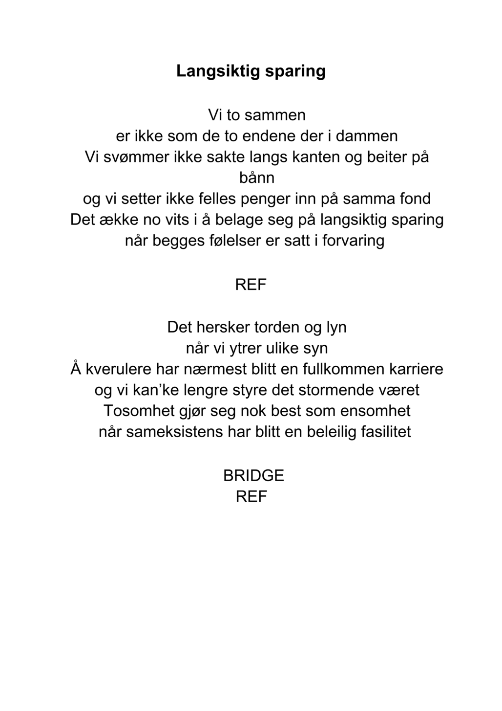 Teksten til "Langsiktig sparing" er en slags finurlig blanding mellom metaforer knytta opp mot naturen, som for vi for eksempel ser i strofene: "Vi to sammen er ikke som de to endene der i dammen." og "Det hersker torden og lyn når vi ytrer ulike syn.", og metaforer som skildrer mer moderne referanser. Eksempler på sistnevnte er "og vi setter ikke felles penger inn på samma fond.", og "Det ække no vits i å belage seg på langsiktig sparing". Nystevet gjorde plass til mer personlig og direkte innhold, og sett ut ifra mitt perspektiv på "Langsiktig sparing" vil jeg si at teksten speiler det nystevet brakte med seg. Forskjellen er at min låt er satt i kontekst med samfunnet nå i 2025, kontra 300 år tilbake i tid.