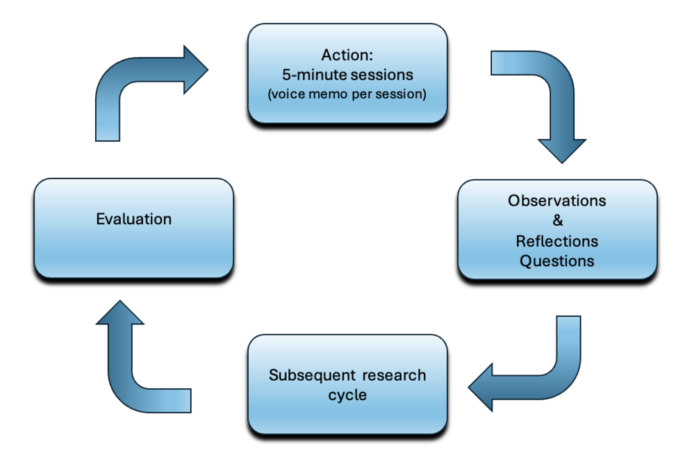 It is important to note that Cycles One and Two were conducted prior to a one-year break due to personal circumstances. Upon returning, I found that I had not only evolved as a musician but also developed my perspectives when re-engaging with the assignment. This development shaped how I reflected on the earlier material and how I approached the later cycles. In this sense, the break became part of the research cycle itself, highlighting how artistic research is intertwined with lived experience and how time can influence both method and outcome. This ended up leading to a revised research model, which is presented below: