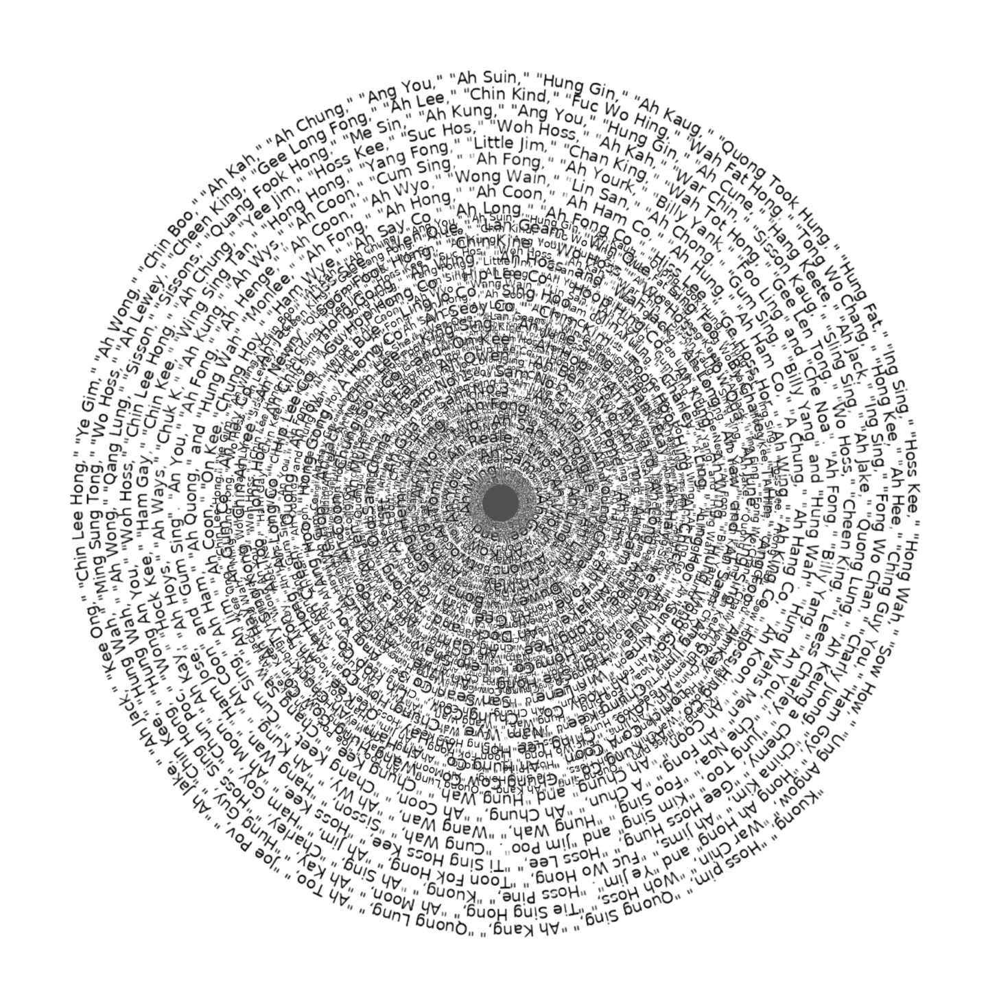 This eye is composed of the so-called 'names' of Chinese railroad workers, as recorded on the Central Pacific Railroad (CPRR) payroll record sheets. These were not real names but fabricated versions made by the railway supervisors, parody names based on improper Chinese pronunciation. As a result, it is impossible to trace the names back to the actual individual Chinese workers. This eye symbolizes how railroad supervisors perceived and dehumanized the Chinese migrant workers whose names are lost.