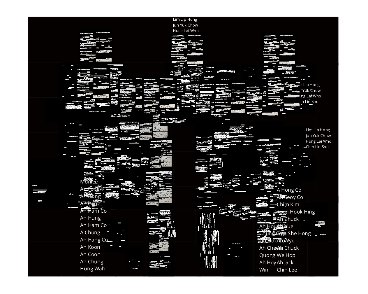 Blackout poetry is a technique where the majority of text from a document is blacked out with a marker or a digital tool. The remaining unmarked text reveals a key sequence of words that reads as a poem, while also commenting on the original underlying source material.[3] I first made 18 blackout poetries from archival documents. I then remixed these poems with the names of migrant workers from Central Pacific Railroad (CPRR) payroll sheetsto shape the Chinese character ‘崩’, which translates as ‘collapse’ in English.