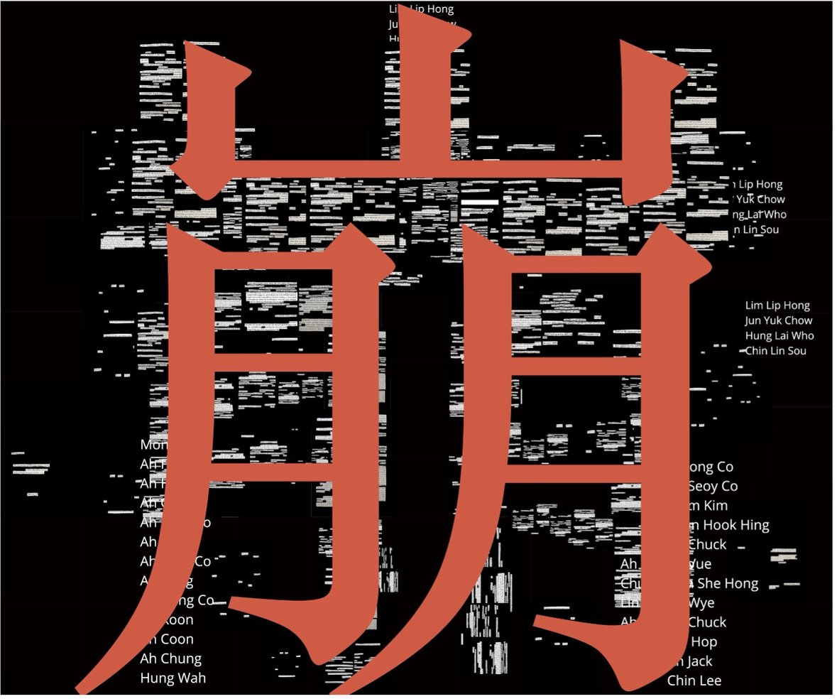 Blackout poetry is a technique where the majority of text from a document is blacked out with a marker or a digital tool. The remaining unmarked text reveals a key sequence of words that reads as a poem, while also commenting on the original underlying source material.[3]  I first made 18 blackout poetries from archival documents. I then remixed these poems with the names of migrant workers from Central Pacific Railroad (CPRR) payroll sheetsto shape the Chinese character ‘崩’, which translates as ‘collapse’ in English.