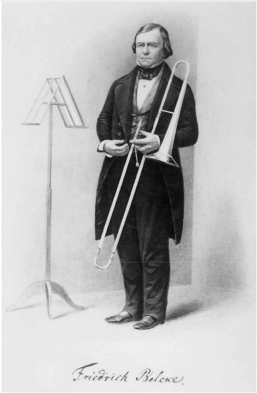 But to return to the instrument that Belcke holds in the portrait, it appears to be one of the earliest depictions of an instrument that represents the new larger bored, fuller sounding style of trombone that was developing in Germany in the early part of the century. One of the most profound developments in the history of brass manufacturing, the invention of the valve, was also to have a significant effect on trombone manufacture. This larger bored trombone was to find its first true proponents in the instrument builder Christian Friedrich Sattler, and the trombone virtuoso Carl Traugott Queisser, to whom we now turn our attention in the following chapter.