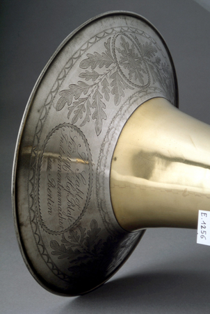 During my investigations into instruments of the period, I have visited a number of collections and examined a great number of trombones both in person and on the internet. The only trombone that I have found up till the present that resembles the configuration of Belcke’s instrument in any way is an F-bass trombone located in a collection in Paris, and built by the Berlin instrument builder Johann Casper Gabler (1770-1818). Gabler was considered one of the finest builders of the day and was successful in obtaining the title of Hofinstrumtenmacher, i.e. instrument builder to the Prussian court[15]. Gabler’s speciality was building instruments in silver and nickel silver, and could be considered one of the first builders to use this material, which is more durable and corrosion resistant than brass (and also much more difficult to hammer or bend). The photos show this unusual configuration and highly decorative bell garland of the Gabler bass trombone from the collection of the Musee de la Musique in Paris.