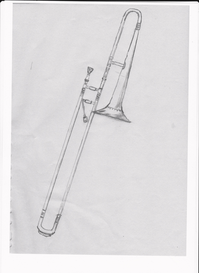 The second and perhaps unique feature of this trombone as depicted is the apparent comparative shortness of the bell section compared to the length of the slide. The slide does appear to be extremely long and upon closer examination seems to be adorned with a small handle attached to the stay on the outer slides, to enable the player to reach the lower positions. The presence of a handle would normally be found on a bass trombone pitched in E flat, F or G, but the dimensions of the instrument as pictured would indicate a tenor trombone in B flat. Belcke does seem to have rather short arms (at least as far as the portrait is concerned), which could explain the application of this short handle. I have attempted to make my own drawing of the instrument based on the portrait. Another aspect of this instrument that sets it apart from the mainstream of trombone design is the proximity of the bell flare to the slide stays and mouthpiece. To have a trombone with the bell situated so close to the players face, placed between the first and second slide position is extremely unusual. It is worth noting that most trombones from the earlier centuries had the bell placed at the fourth position. And certainly most trombones produced after the eighteenth century have the bell placed either at the third position of slightly lower.
