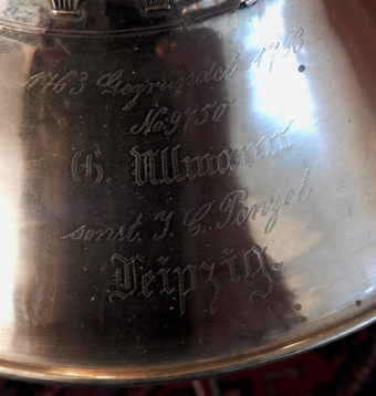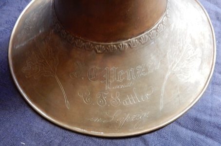 By pure coincidence, in the year 2017 we commemorate the two hundredth anniversary of the birth of Johann Christoph Gottlieb Penzel, one of the more significant builders of trombones in music history. He was born in Elster (now Bad Elster) on March 15th, 1817 and according to the Markneukirchen historian Enrico Weller[11] appears to have learnt his trade as brass instrument maker in Adorf near Markneukirchen. Later he appears to have followed the path of travelling apprentice, and found his way to Leipzig and the tutelage of C.F.Sattler. After Sattler’s death in 1842, he took over the workshop in the absence of any male heirs and three years later married Sattler’s daughter Pauline. The workshop remained in business under Penzel’s name until the death of Penzel’s son Robert in 1880, who outlived his father by a single year, although it appears that the maker Gustav Erhard Ullmann and later his son Reinhold Oscar carried the mark further onwards to well into the twentieth century. Although Penzel advertised himself in the Leipzig city address book as builder of “Signal horns, chromatic valve horns, trumpets and every sort of brass wind instruments”[12], it was as a builder of trombones that his posthumous reputation now rests. Although there was a considerable number of instrument builders in the town of Leipzig during the early part of the century, Penzel’s fame as an instrument builder spread widely during the 38 years that his workshop flourished. Indeed when the Vienna Philharmonic decided to abandon the valve trombone in 1883 it was the Penzel workshop (then led by G.Ullmann) who provided the set of trombones (an alto, tenor and tenor-bass) in the absence of any Viennese makers familiar with building slide trombones. It is also worth noting that two separate lines of Penzel’s apprentices, the Ullmann’s Gustav and Oscar, and Hermann Robert Schopper both claimed to be Penzel’s Nachfolger (successor). In fact both father and son Ullmann’s instruments are engraved with the (Seit)1763 date of Sattler’s establishment, to confirm their continuance of the mark. Furthermore, two later, highly renowned firms, the Ed. Kruspe workshop in Erfurt (est. 1864), and Robert Piering in Adorf, also advertised a Penzel-Modell in their catalogue, and the instruments they produced are very much in the Sattler/Penzel mould[13].