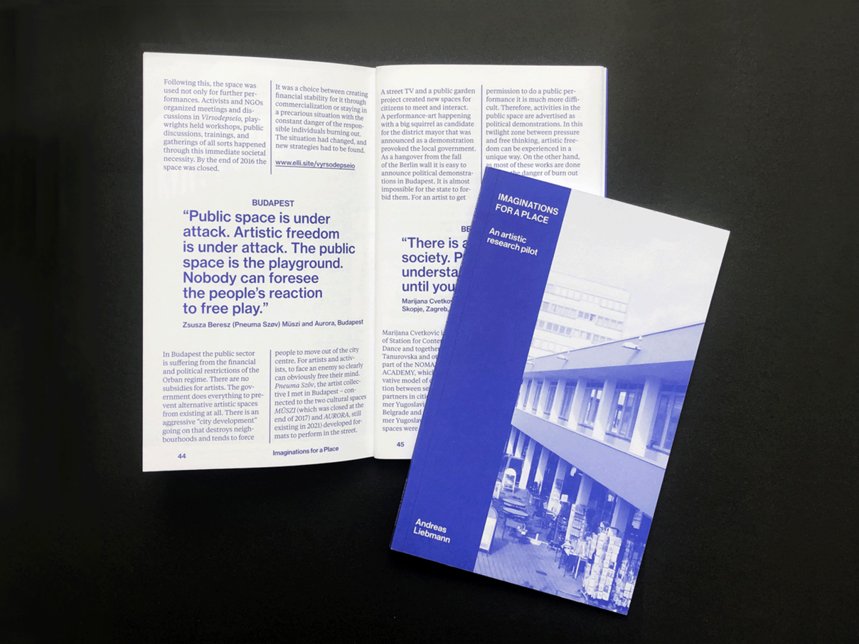 This publication by artist Andreas Liebmann gives an account on his artistic research project "Imaginations for a place". It draws the first steps into an site specific instituting practice that started with the question, posed to random passers by in the Copenhagen suburb Tårnby: "What is your public life in Tårnby".