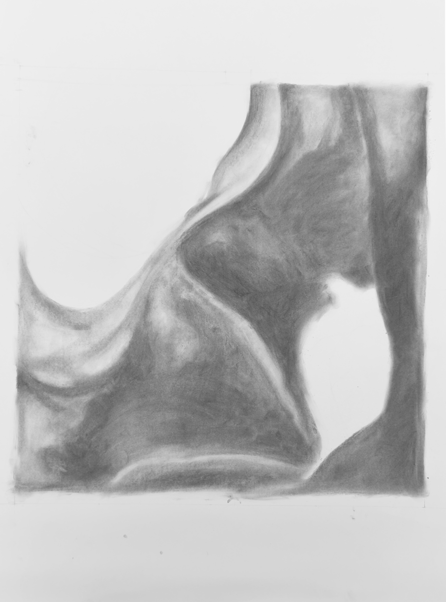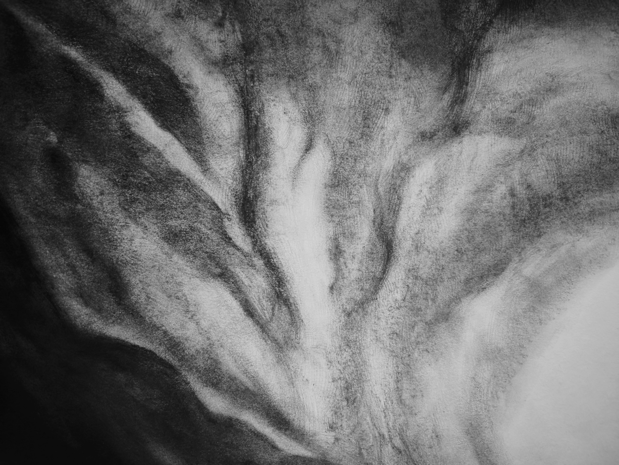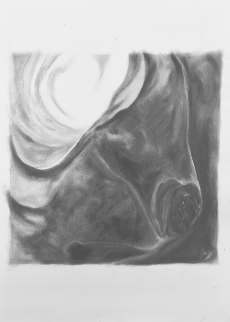 Illumination within the image is not introduced additively but rather through subtraction. Using a coarse eraser, I actively remove portions of the fixed surface to reveal lighter areas beneath. This subtractive technique does not simply “erase,” but excavates light from within the accumulated layers, creating contrast, focus, and spatial orientation. In this way, the image is constructed through a dialectic of presence and absence, of deposition and removal.