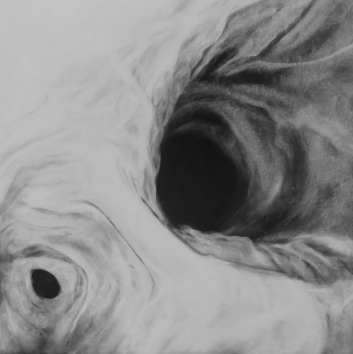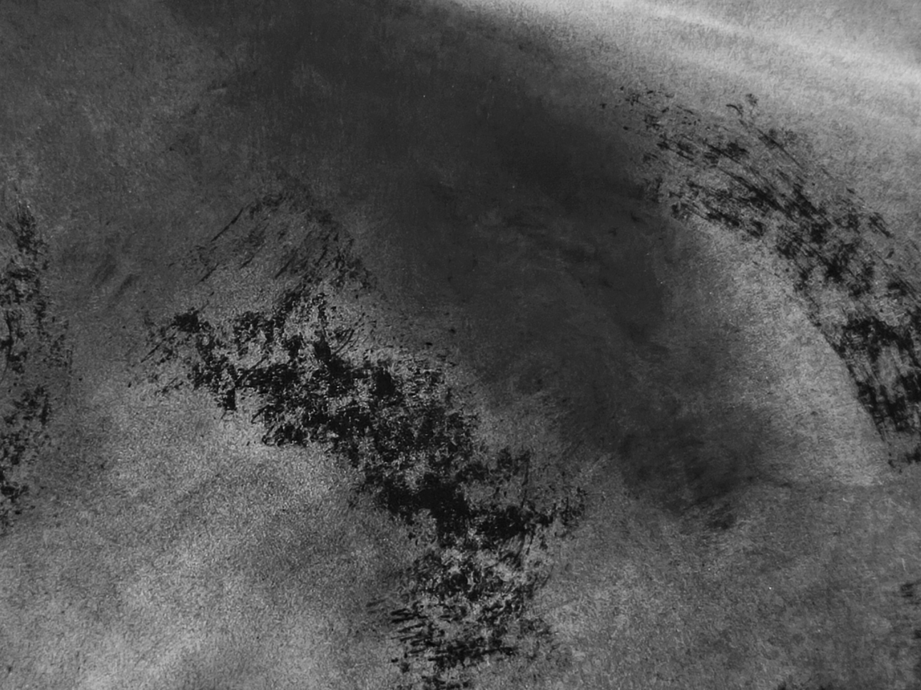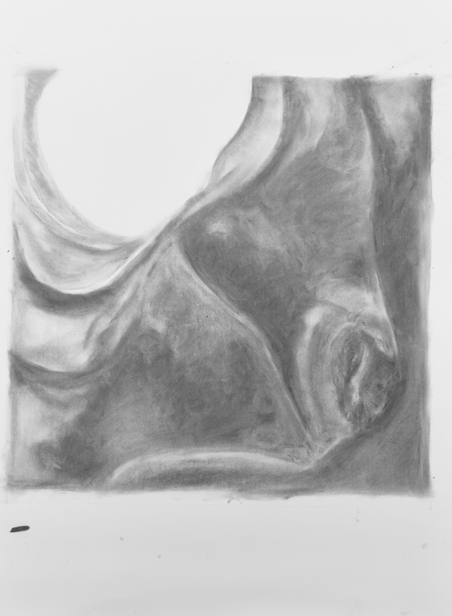 Illumination within the image is not introduced additively but rather through subtraction. Using a coarse eraser, I actively remove portions of the fixed surface to reveal lighter areas beneath. This subtractive technique does not simply “erase,” but excavates light from within the accumulated layers, creating contrast, focus, and spatial orientation. In this way, the image is constructed through a dialectic of presence and absence, of deposition and removal.
