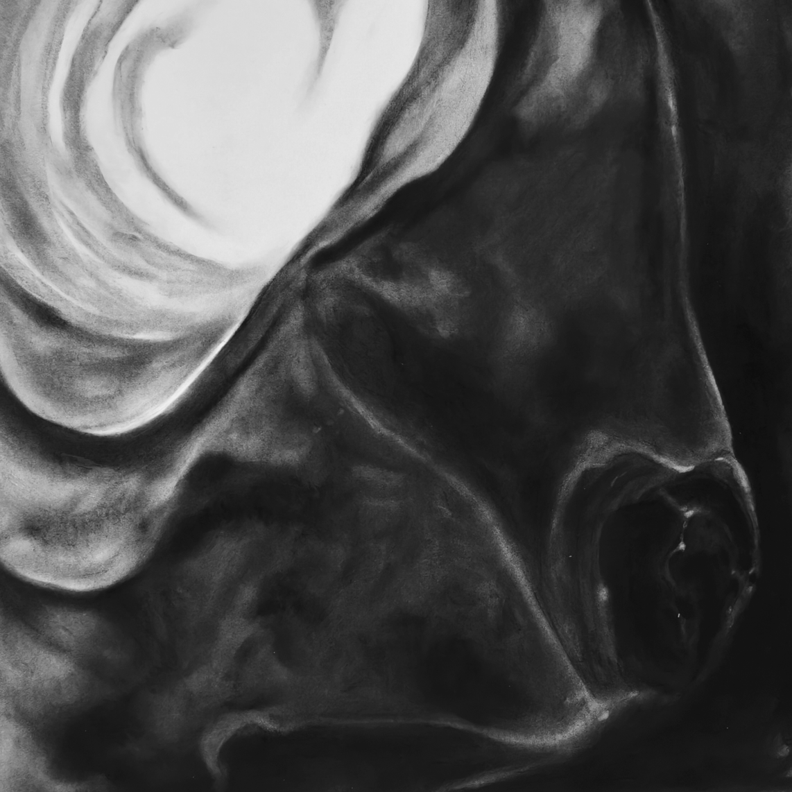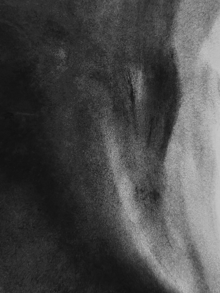 To reach the deepest tonal registers, I introduce a second material: a soft black pastel. Its rich, velvety texture and capacity for full saturation allow for a substantial increase in visual density. Unlike charcoal, which can remain somewhat volatile even when fixed, the pastel adheres with greater intensity, enabling me to articulate the darkest zones of the composition with heightened precision and physicality. The two materials—charcoal and pastel—operate in complementary roles, each enhancing the expressive range of the other.