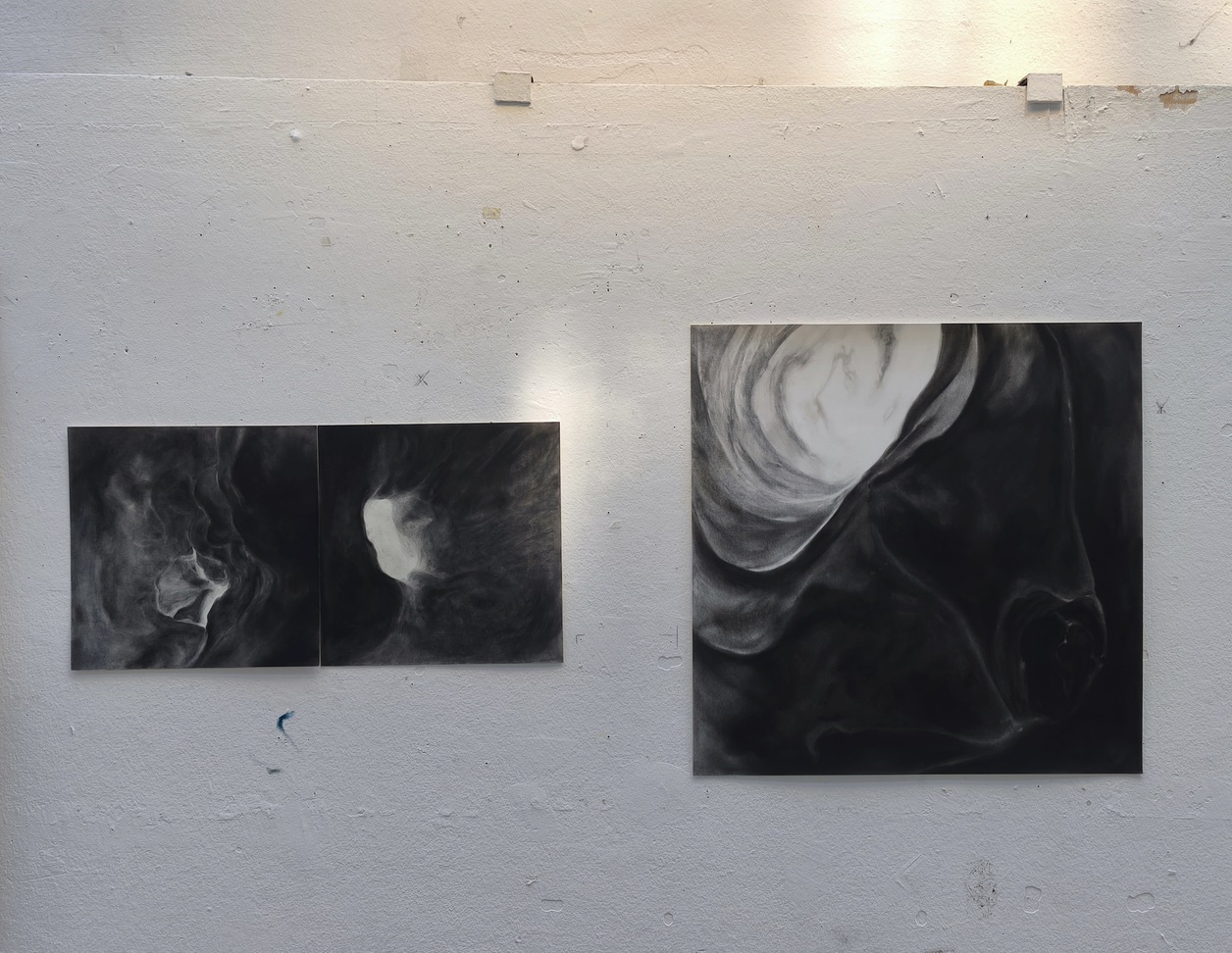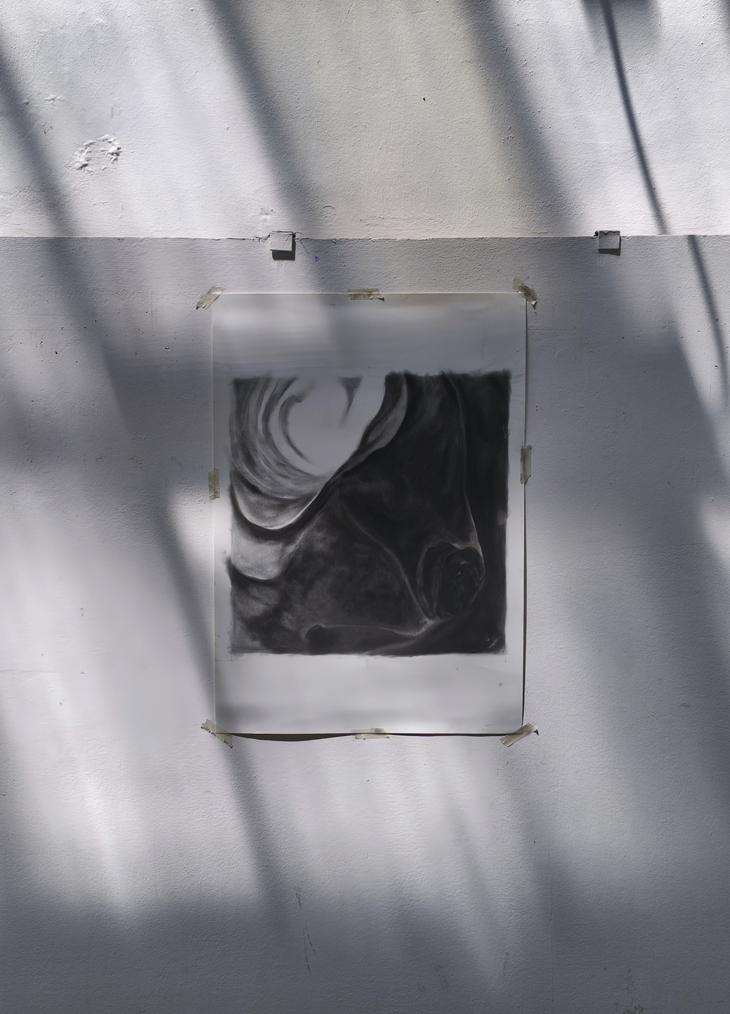 The notions of entry and exit within my visual research are articulated through a carefully constructed stratification of dark tonalities, which function as progressive indicators of spatial depth. This spatial articulation begins with the application of charcoal—used to establish an initial tonal groundwork across the surface. These foundational layers serve not only as a backdrop but as an atmospheric base upon which subsequent tonal shifts can emerge.