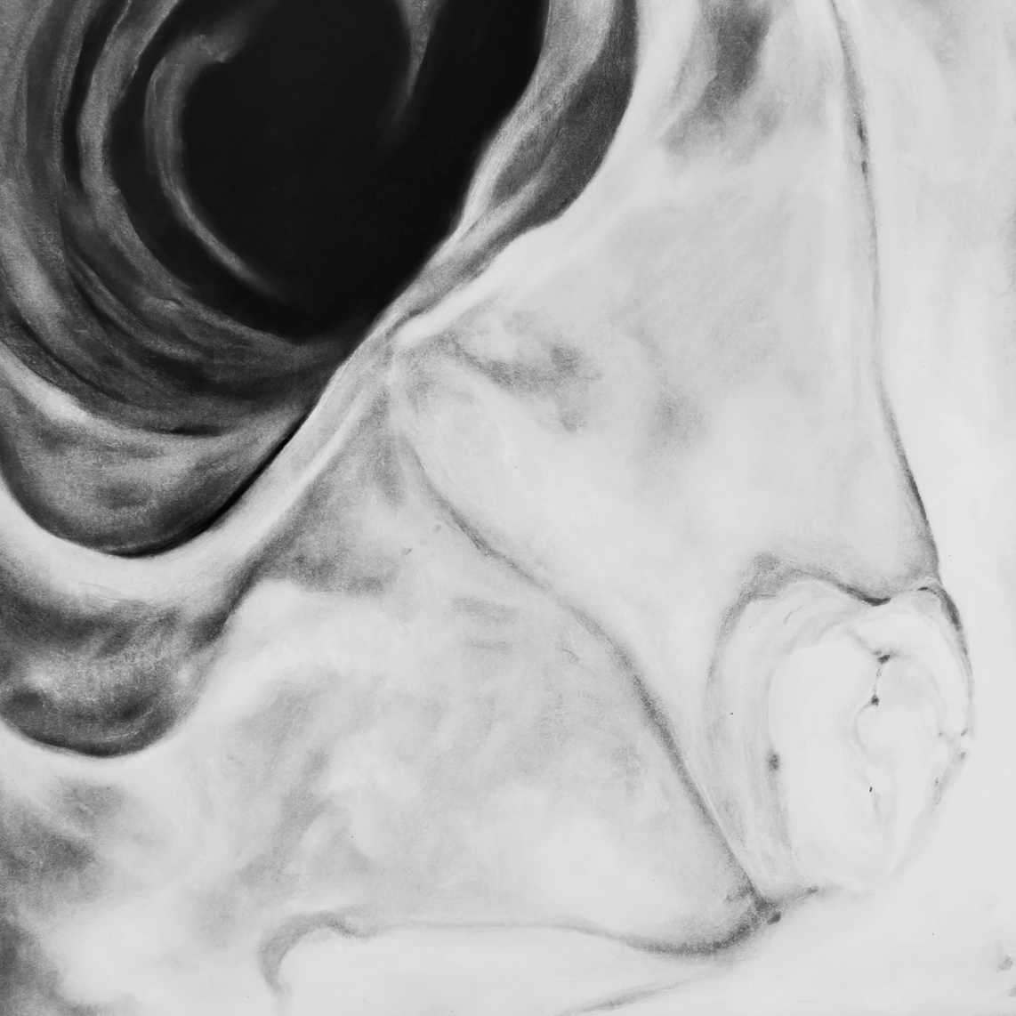 To reach the deepest tonal registers, I introduce a second material: a soft black pastel. Its rich, velvety texture and capacity for full saturation allow for a substantial increase in visual density. Unlike charcoal, which can remain somewhat volatile even when fixed, the pastel adheres with greater intensity, enabling me to articulate the darkest zones of the composition with heightened precision and physicality. The two materials—charcoal and pastel—operate in complementary roles, each enhancing the expressive range of the other.
