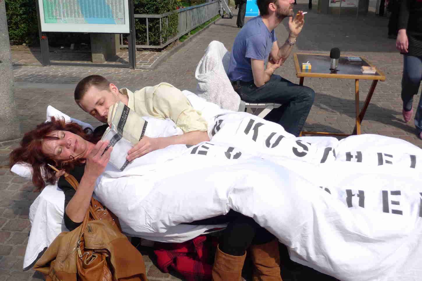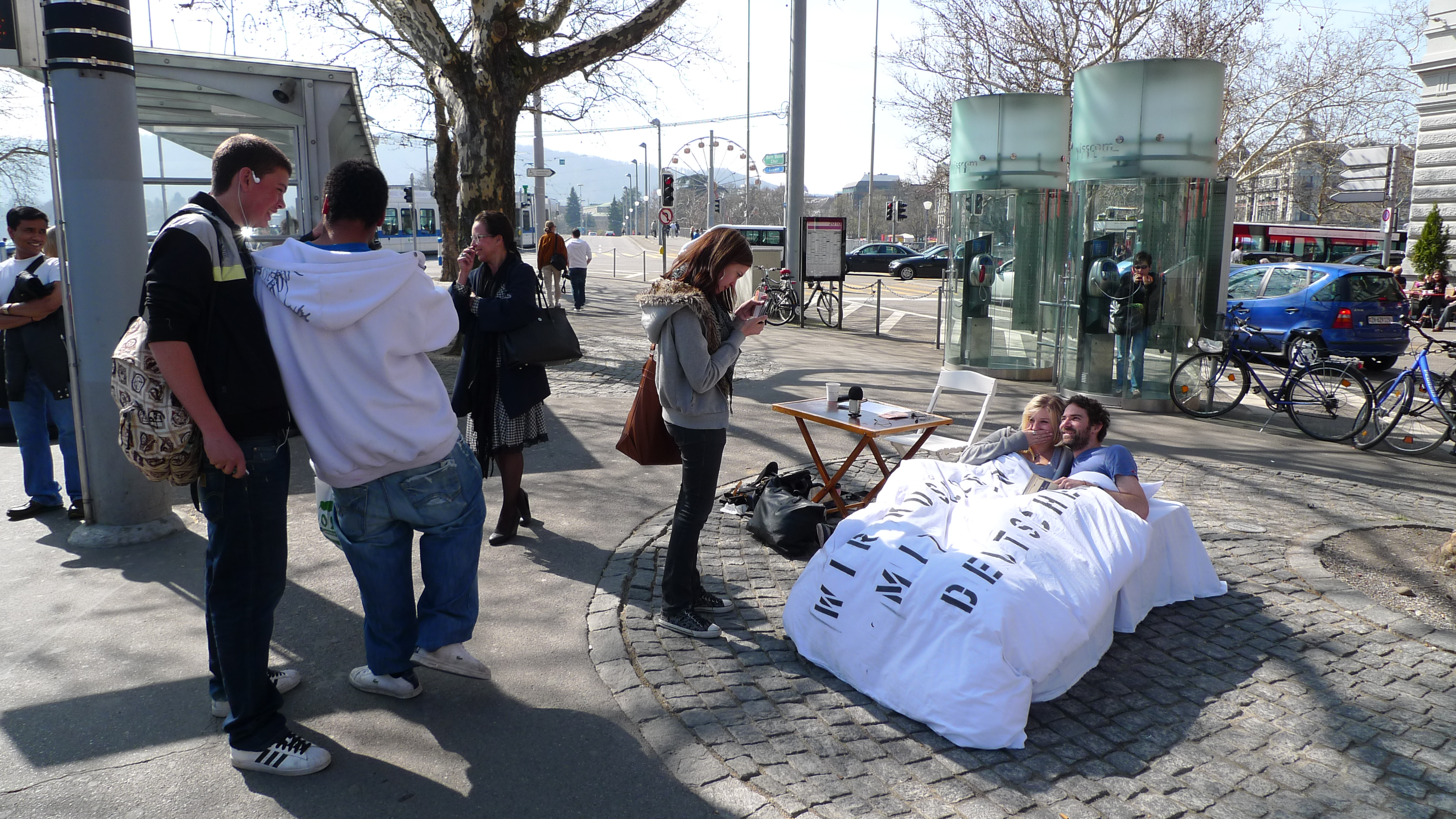 "Kuscheln mit Deutschen" (Cuddeling with Germans) was a public cuddle action as response to the increasing negative public discourse about the Germans in the german part of Switzerland. Marcel Schwald and Andreas Liebmann invited passengers for a cuddeling session and read Julius Caesars book about the Germans. In a second step we created a cuddle space at Gessnerallee Zürich.