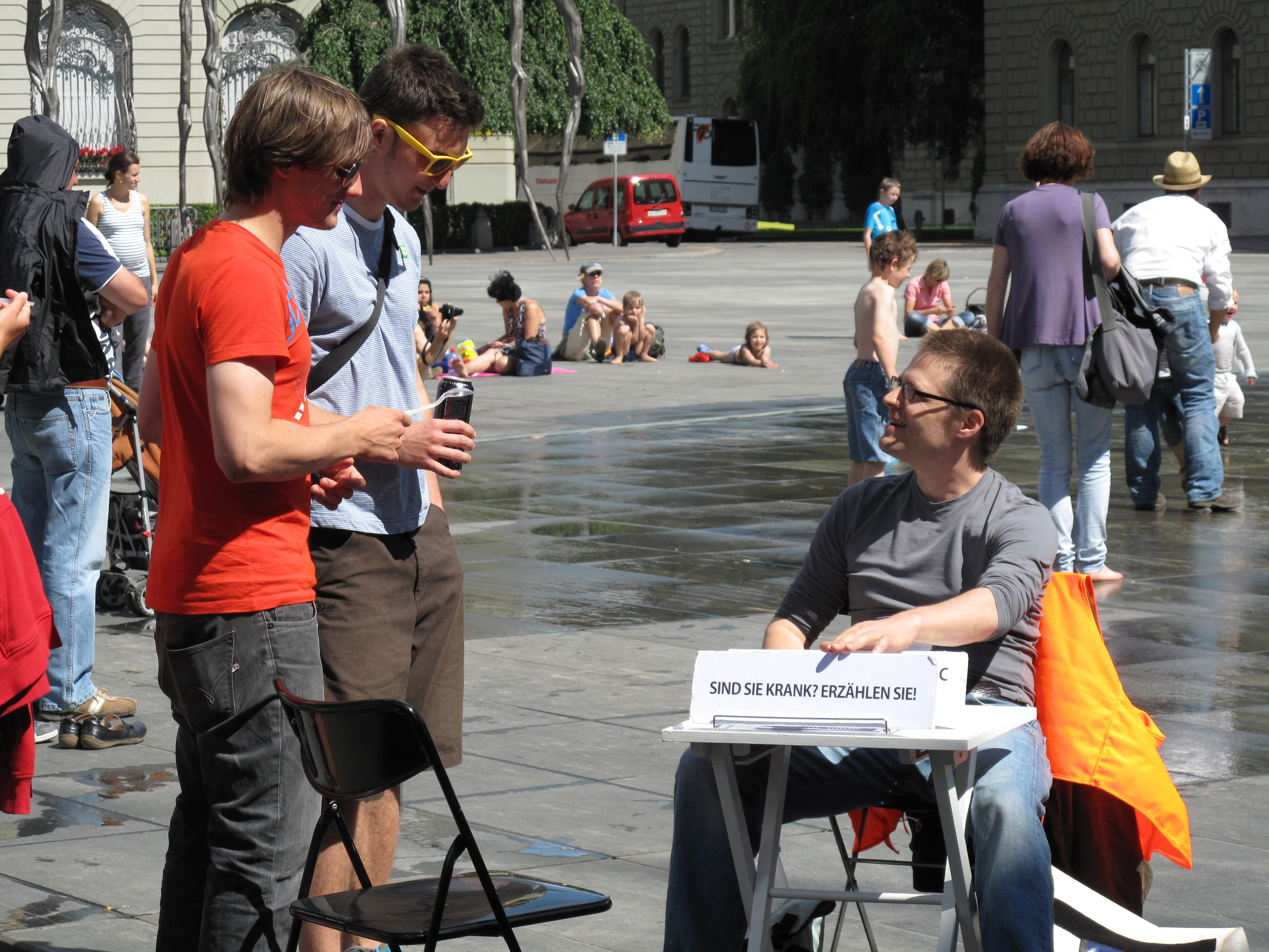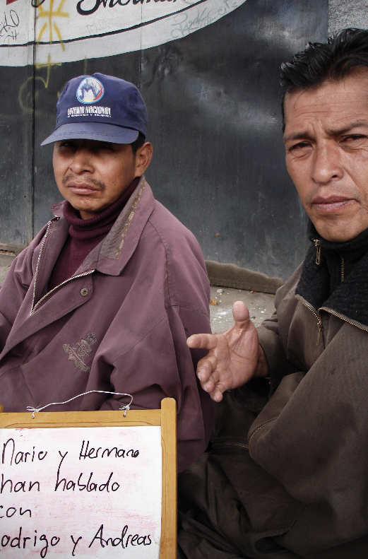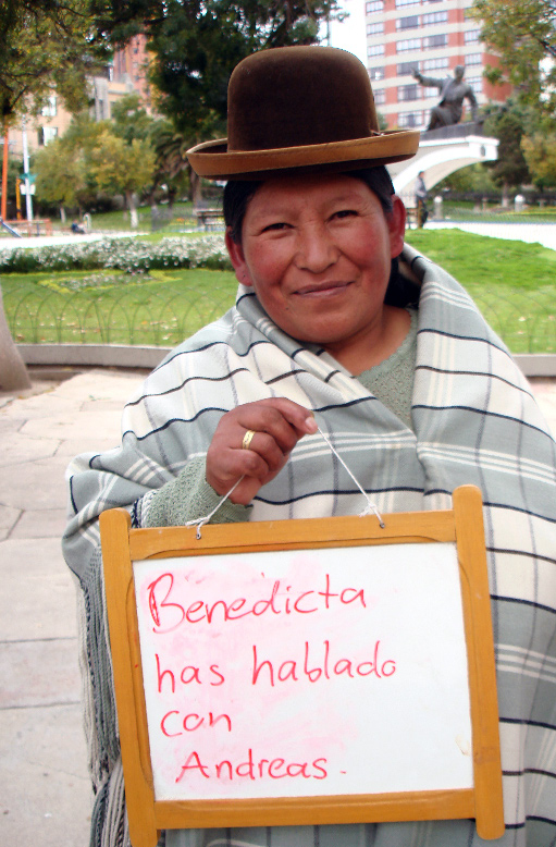 performance in the mountains of Bolivia in La Paz and the nucleus for what later became a principle for many following works: The dialogue with passers by as the basis for research, performance creation and for instituting. The performance originated in the question of where and who I was - as a Swiss artist without a clear grounding in an own practice visiting a mainly unknown country. So I asked people to tell me about themselves. A way to get to know the country bette, its people - and also myself. Street Performance, Exhibition at Museo Tambo La Paz, Book.