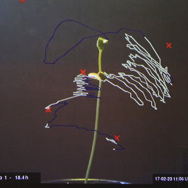 Movement of a bean plant is feedback controlled through blue and white lights as it grows.