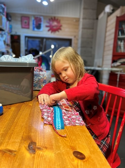 Tilan jättäminen yllätyksille osoittautui oikeaksi, sillä neljän tytön lisäksi pienet 5- ja 7-vuotiaat sisarukset Anne Karen ja Inga Elean[31] tulivat mukaan tekemään duodjia ja seuraamaan isompien tyttöjen tekemistä. Duodjin oppimisessa onkin luontevaa seurata kokeneempaa tekijää. Improvisoimisen mahdollistaminen täydensi pedagogisen praktiikan pyrkimystä innostaa, opettaa duodjia ja välittää hiljaista tietoa kokeneemmilta noviiseille, usein vanhemmilta nuoremmille. Havainto tuki taiteelliseen tutkimukseen kuuluvaa yllätyksellisyyttä kokeellisen ja kokemuksellisen toiminnan kautta (Magga M. 2024, 50; Anttila 2006, 96–97; ks. Pöyhtäri 2021, 74; Schülke 2017, 36; Nugraha 2012, 10–15; Hannula ym. 2003, 9).