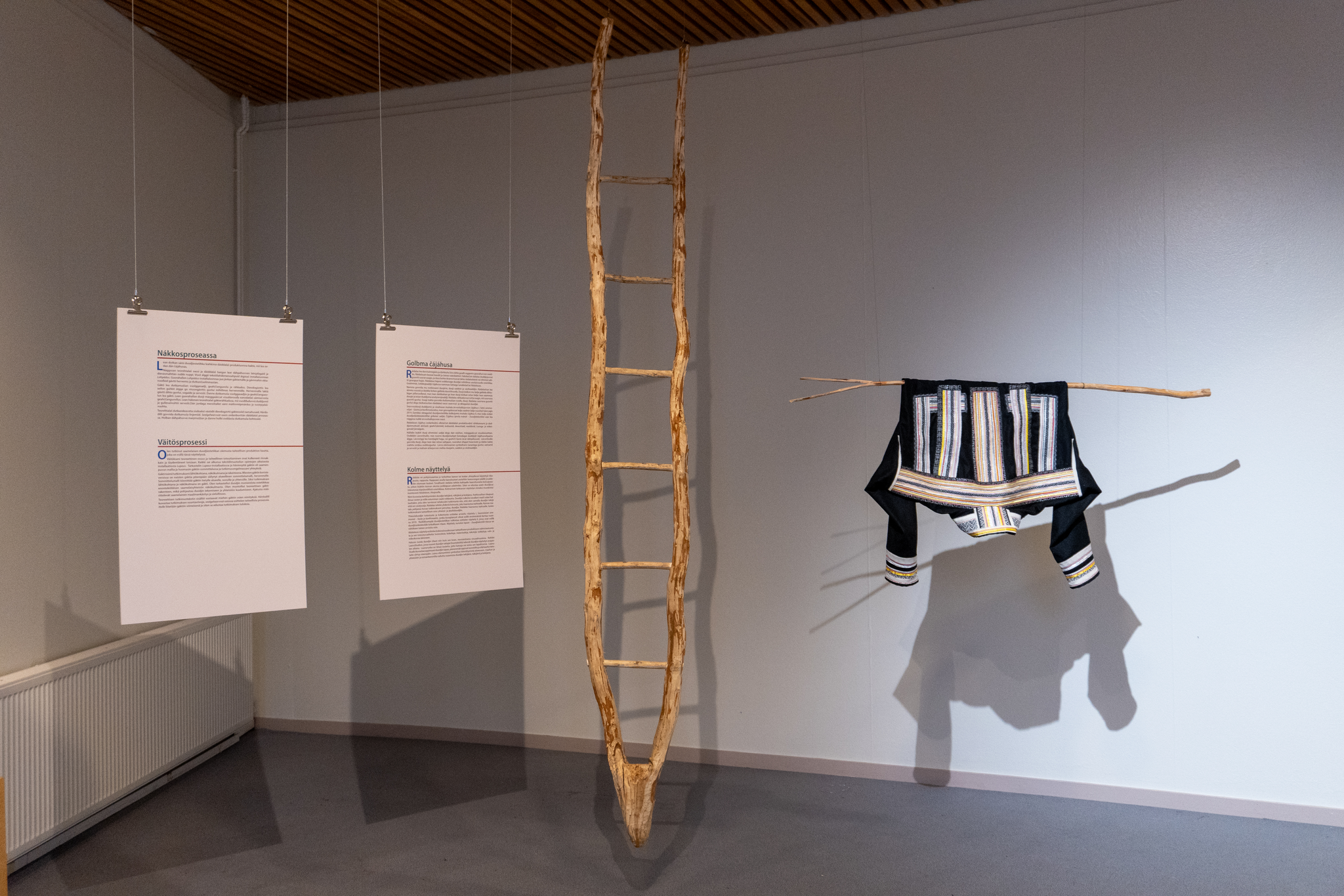 Kun valmistauduin väitökseni kolmanteen, kokoavaan näyttelyyn, aloin pohtia duodjin kokonaisvaltaisuutta ja näyttelyn saamelaistamista. Pohdin, miten esittelisin tutkimukseni taiteellisen osion saamelaisen ajattelutavan mukaisesti ja miten toisin duodjin kokonaisvaltaisen olemuksen ja siihen liittyvän moniaistisuuden julkiseen tilaan niin, että se avautuisi katsojalle. Kaksi ensimmäistä väitökseeni kuulunutta taiteellista produktiota esittelevää näyttelyä oli suunniteltu lähinnä tilojen tarjoamien mahdollisuuksien mukaan, ja niissä oli hyödynnetty olemassa olevia näyttelyrakenteita. Näyttelytiloina olivat Tunturi-Lapin luontokeskus Enontekiöllä sekä Siida-museon tilat Inarissa. En pohtinut kahden ensimmäisen näyttelyn yhteydessä sitä, kuinka katsoja kokee duodjin tai millaisen käsityksen hän duodjista saa. Olin tuottanut kaiken näyttelyn sisällön[17], ja alan ammattilaiset olivat asettaneet sen nähtäville näyttelyille suunniteltuihin tiloihin.