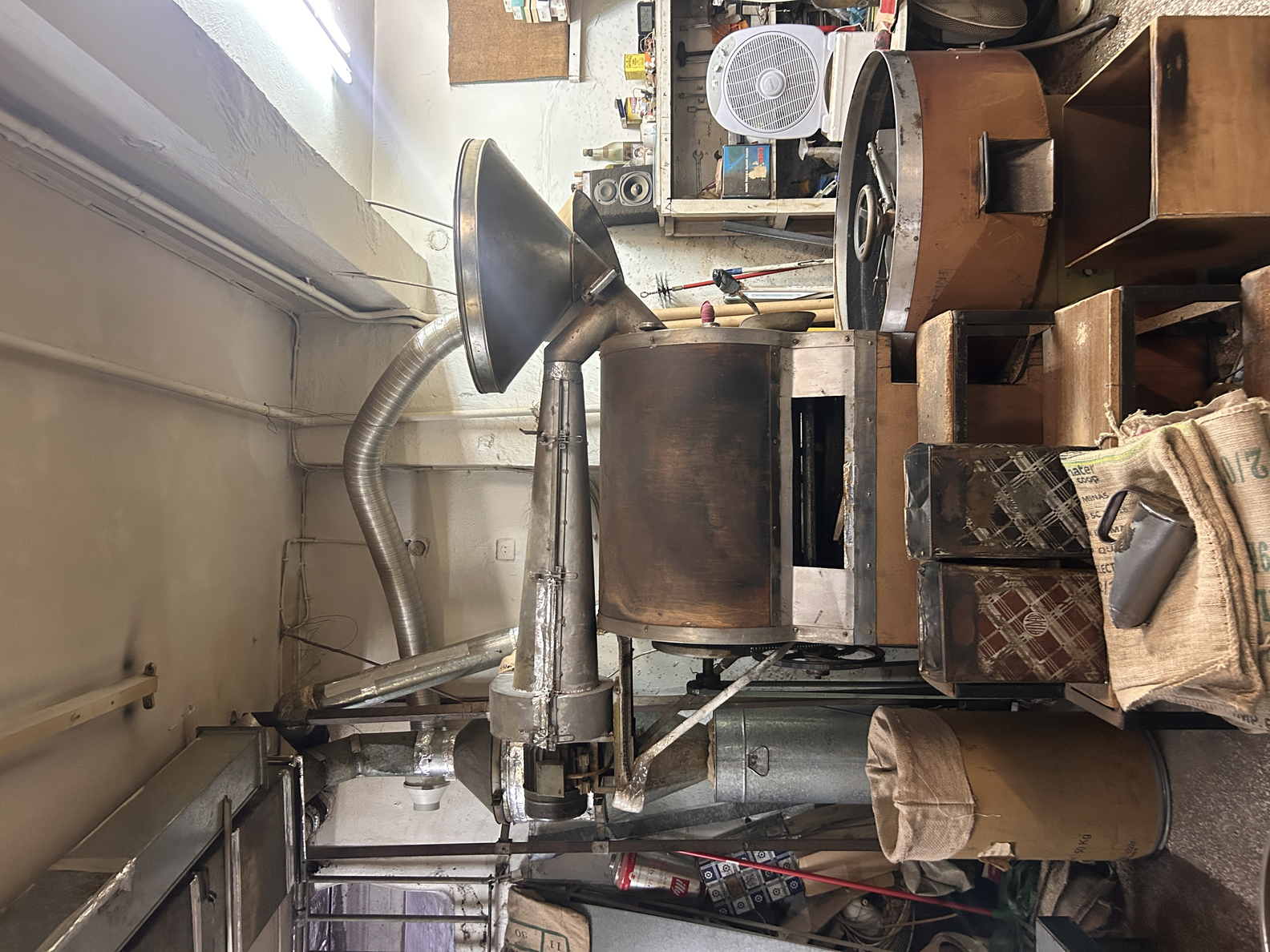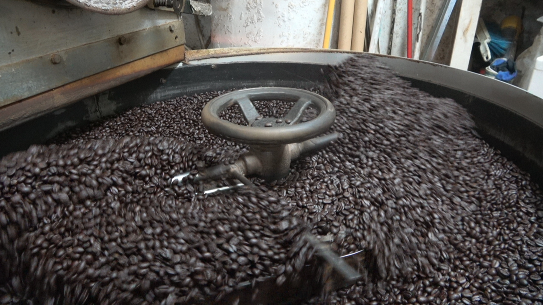 We are at the final step before coffee becomes ready for preparation and consumption. We are processing the coffee from its raw form — it’s cleaned but raw — to the stage where it is roasted properly. Roasting is actually the most crucial processing stage. You start from something you wouldn’t imagine consuming — a greenish-yellow bean — and you end up with a black bean that you could even chew, it has taste. Then you grind it, etc. Roasting is the essential work, an art in itself. We do this process so that someone can take the coffee and prepare it fresh.
