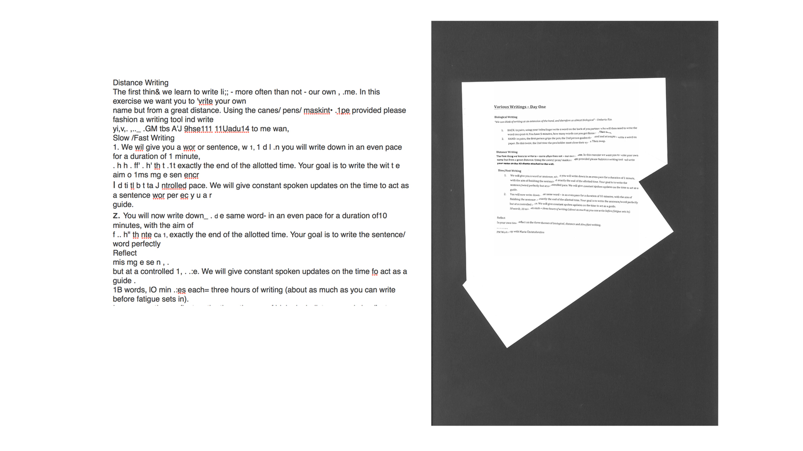 Studies presents a selection of artworks generated by Various Writings. It is an archive-in-progress, indicating how Various Writings engage with research and practice by adopting certain methodologies to become a perpetual generator of activity. Some of the objects/images relate to Flusser’s nine distinct conditions of writing. Other works and studies are particularly informed by the games and restraints of the French-speaking group of writers and mathematicians, Oulipo, and methods of adapted antonymic translation.