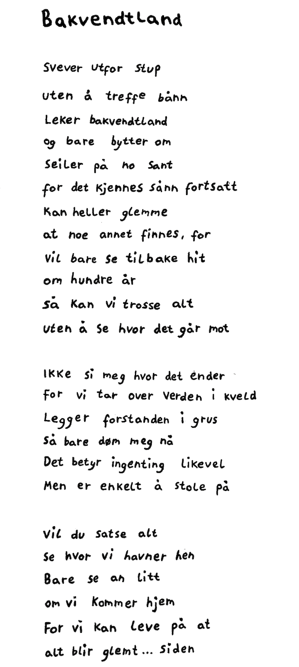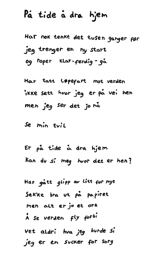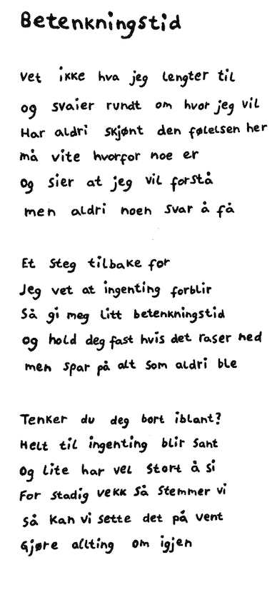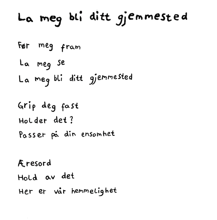 Tekstmessig ville jeg videreføre musikkens mystiske preg, uten at det ble alt for tungt. Samtidig var det krevende når melodi og frasering allerede var satt, og på sånne låter tenker jeg det foniske nesten er like viktig som det meningsbærende.