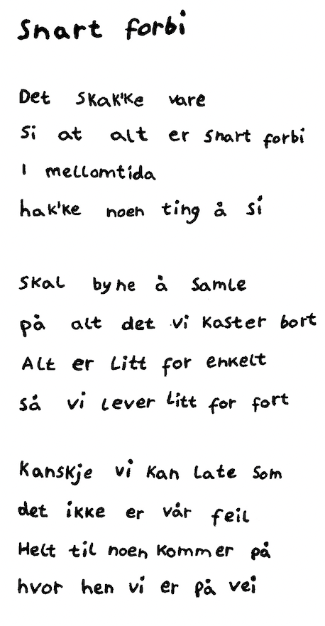 Hver sang man skriver er en egen prosess, men jeg skal forsøke å si noe mer generelt om hvordan jeg har jobbet. Jeg tenkte tidlig at jeg skrev til en plate, der silhuetter av storformen var tydelig, og jeg tenkte lenge på ideen om plata mer enn å faktisk konkretisere og skrive så mye. Litt fordi jeg hadde masse å gjøre, og litt fordi det er krevende å starte på nye store prosjekter.