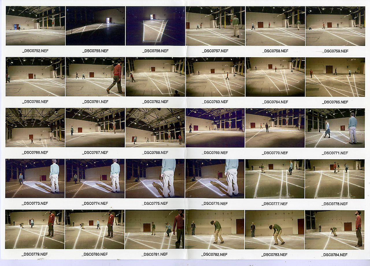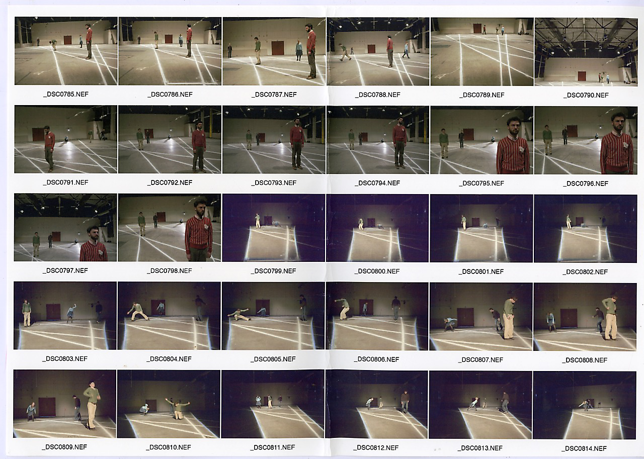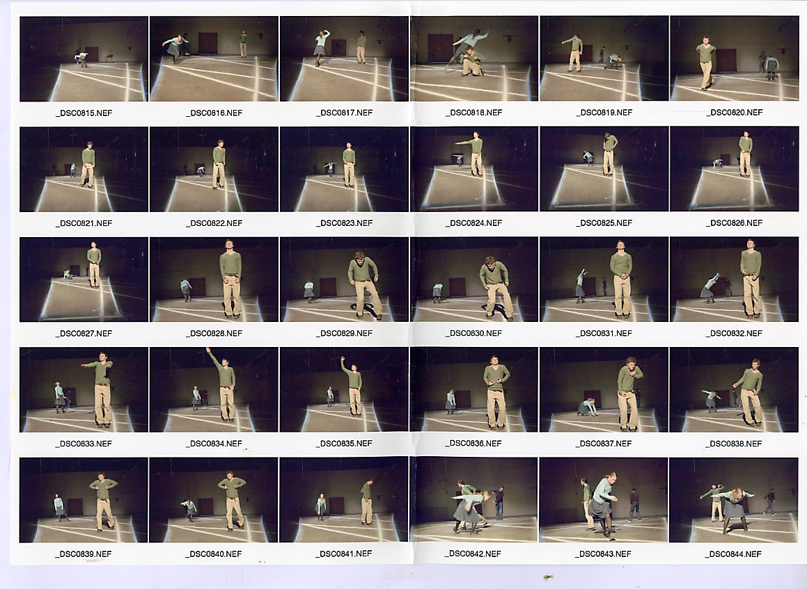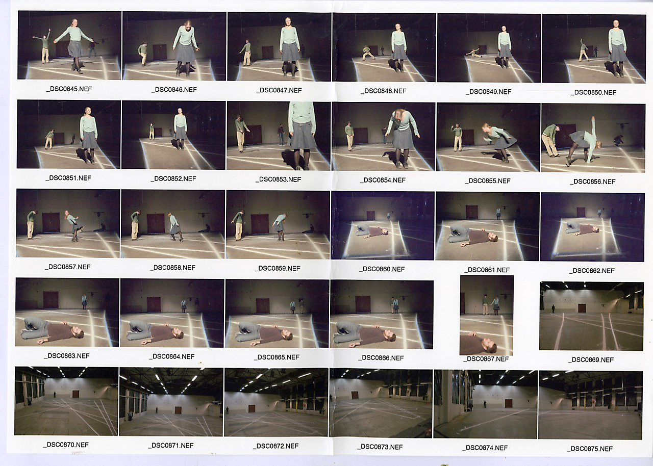 In the process of creating the dance performance ”O” (2005), a work aiming to outline the presence of absence, we worked with the task of physically addressing holes, without the use of words. The practice; following every thought and impulse with actions and movements in an interrupted flow, tried to fill the ever-present hole of the room, created by the floor, the walls and the roof. After a certain amount of time, approximately 15-20 minutes into this practice, all four dancers had done all the actions and movement they possibly could think of doing, and arrived to a natural stand still. (See images _DSC0792NEF to _DSC0798NEF below.) This pause recurred every time we practiced, and finally it became a leading element building the structure of the piece.