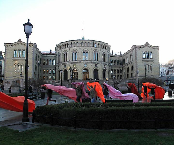 The orange/pink wave vs the blue/blue wave in front of the parliament on 16 of October 2013, the day of the installment of the right wing government, with Pernille Holden, Venke Marie Sortland, Marte Reithaug Sterud, Eivind Seljeseth, Marianne Skjellbred, Sigrid Kopperdal, Kristin Helgebostad, Ingerleiv Berstad og Brynjar Åbel Bandlien.