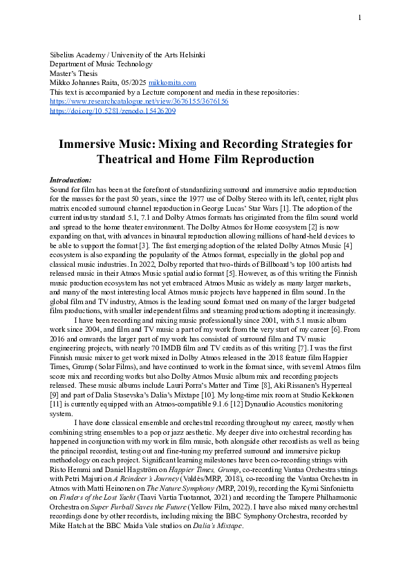 Immersive Music: Mixing and Recording Strategies for