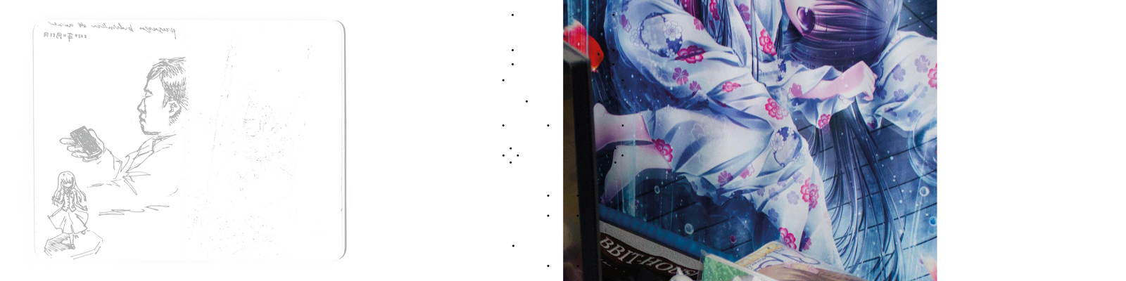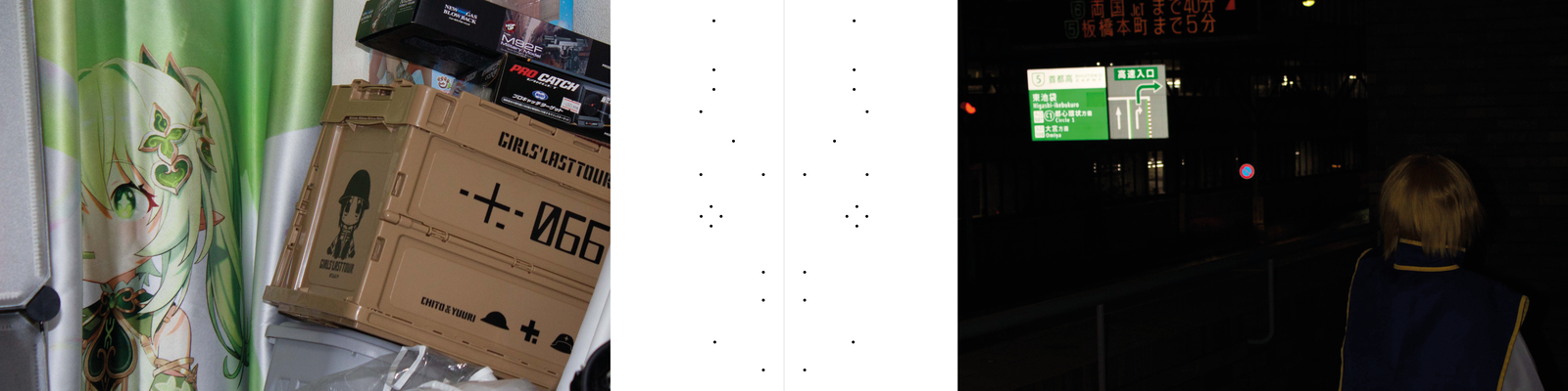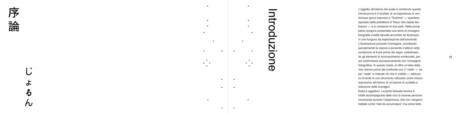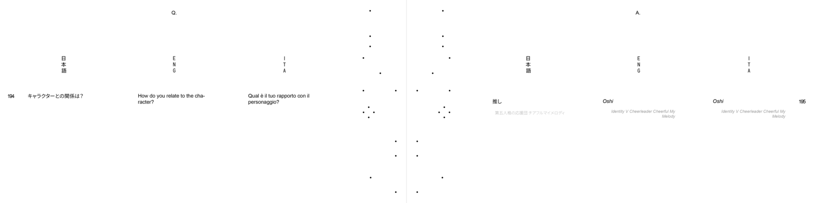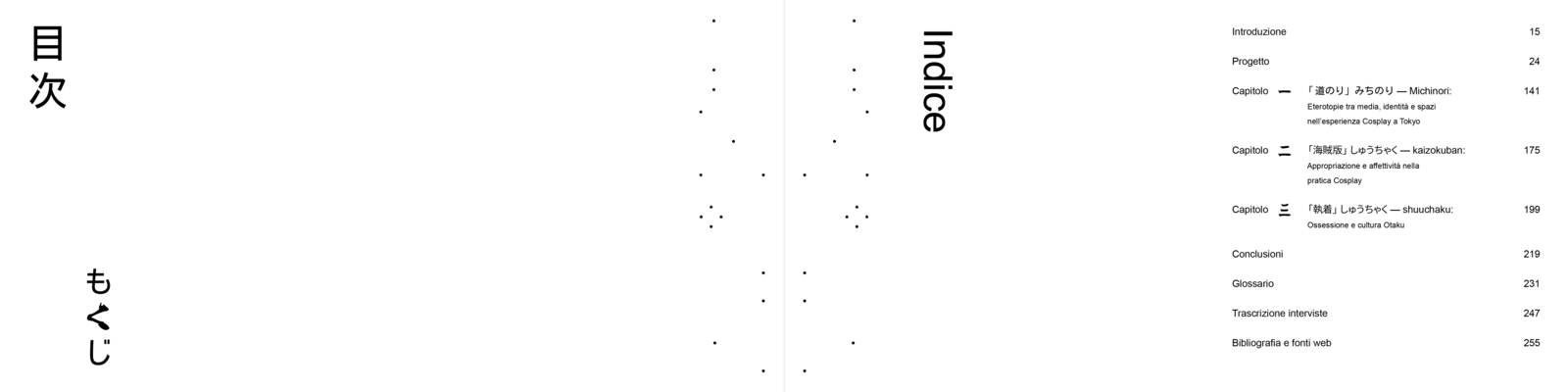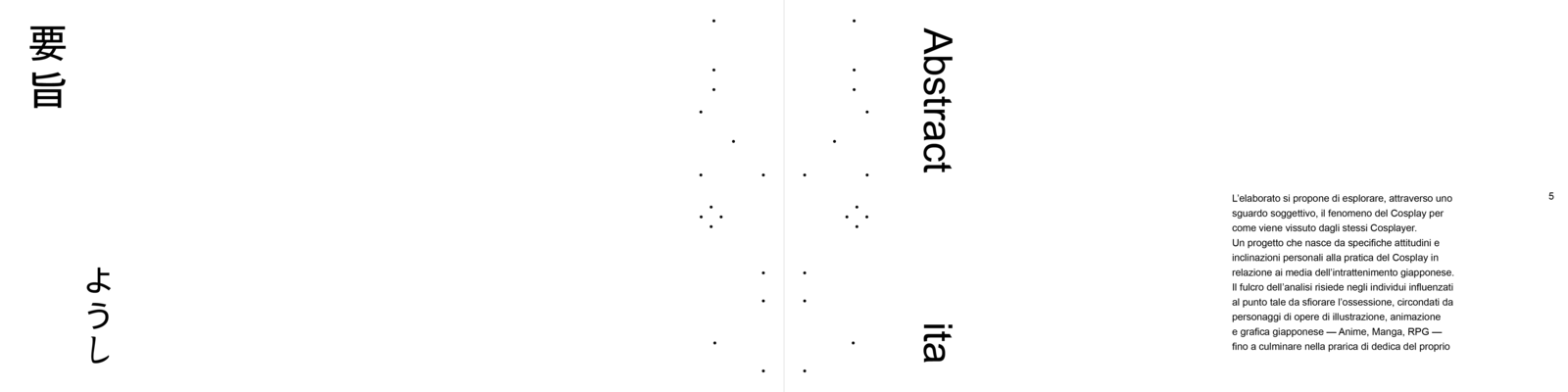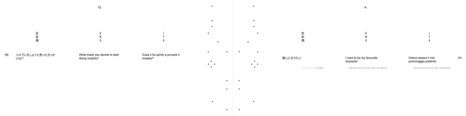 Consistencies and idiosyncrasies between assumptions and experience are addressed starting from Japanese imagery, cultivated by years of tactile and vivid experience of this practice as carried out in Italy. The impact and perceived impact of the journey facilitated a firsthand, lived experience through my month-long stay in Toshima, one of Tokyo’s twenty three special districts. The reiteration of this practice in the country accredited for the birth and export of Cosplay, put to test the skills and preconceptions developed over years of experience and virtual exploration. Analyzed the ideological presuppositions set forth by Luca Vanzella in Cosplay culture: fenomenologia dei costume players italiani, found within my personal experience in Italy, the same were used as a key to reading and interpreting the experience in Japan, analyzing points of contact and divergence. Through this paper I wish to document the vivid aspects of a research at a still embryonic state, without rushing to judgment. A vision that is not intended to be faithful to reality as a focused image, but rather as the perception of light imprinted in the first impact with the retina. It represents, in its essence, an investigation that reports testimonies and subjective experiences, exploring with individuals the value placed on their choice of character, the reasons for choosing to lend one’s body to such practice. The unambiguous presence of the self, versus, the assumptions of loss of identity and desire for escape in the link between Cosplayer, performance act and self-perception. Analyzing the relational dynamics between Cosplayers and those shared personas, with a focus on the figure of the otaku and the way it relates to this practice.This printed object consists of 2 main parts; the first visual and graphic and the second textual and theoretical. Bound together by the “japanese stab binding” technique, that has been appropriated in correlation to the practice of Cosplay. Becoming not only a physical link, but also a key conceptual and graphic element. Giving body and matter to the characters that make up the term Cosplay.