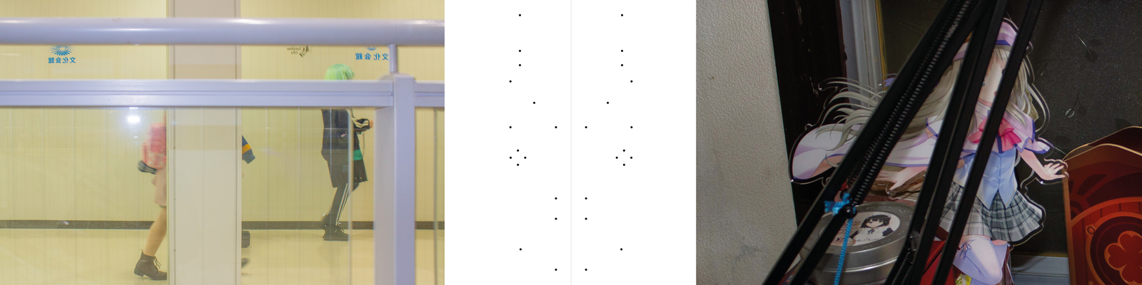 The term Cosplay — rendered in its Japanese form コスプレ — is embodied through the thread that connects the two sections of the work, both physically and symbolically. This gesture reflects the nature of Cosplay itself: a practice grounded in corporeality. The Cosplayer offers their body in an act of affectionate appropriation, embodying figures that do not originate from the self.