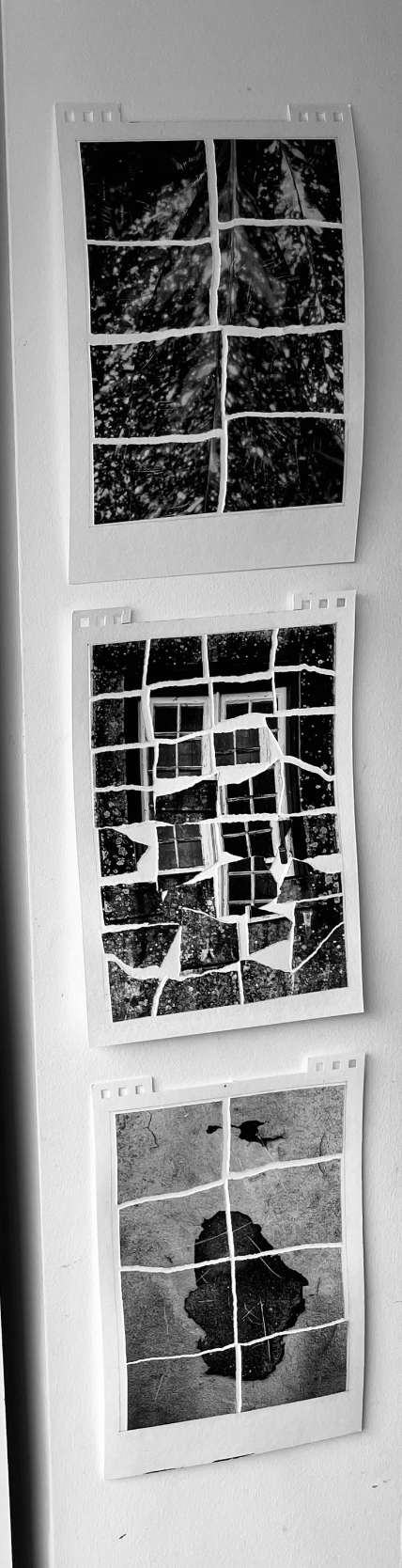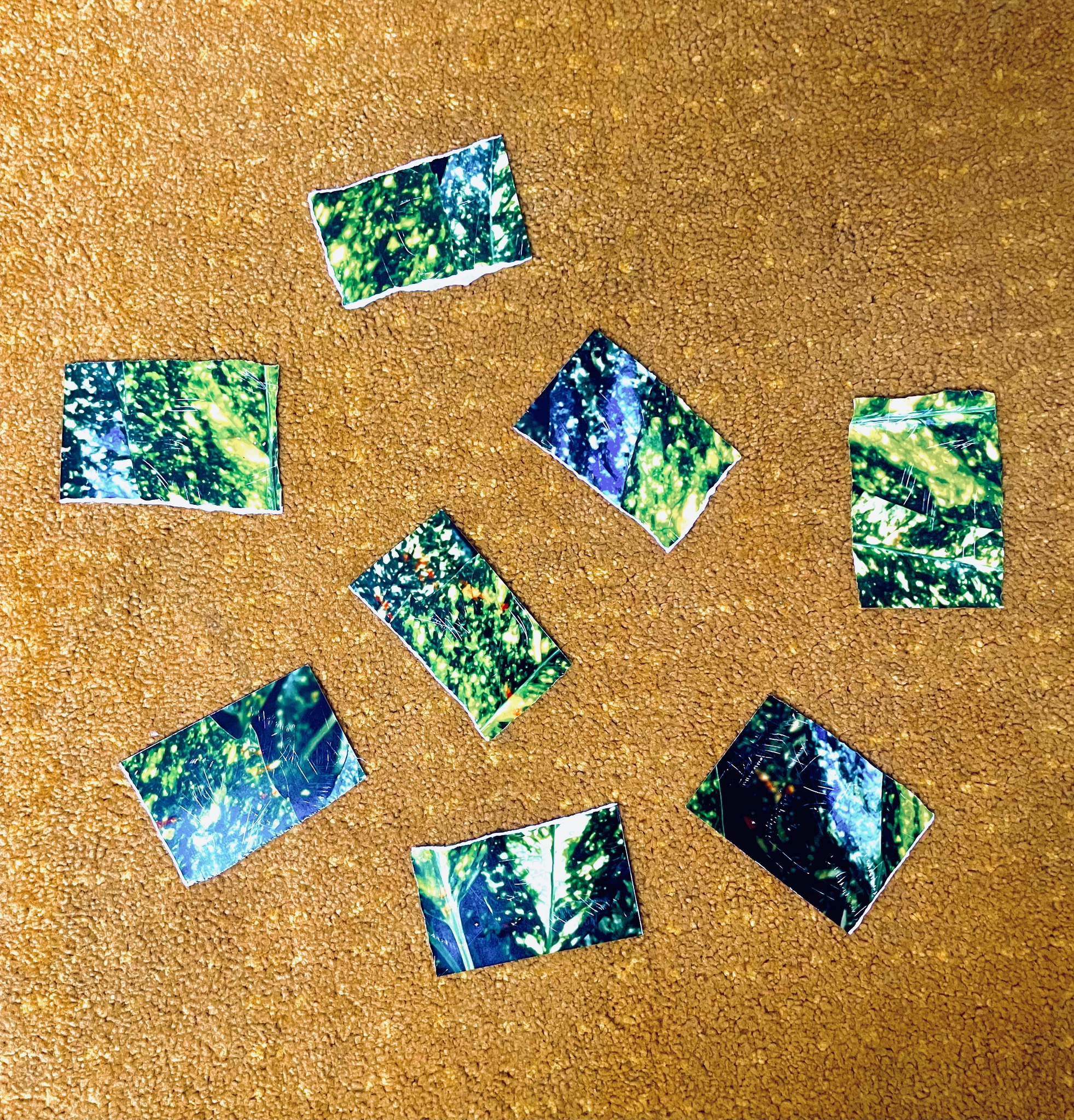 In an attempt to explore the destruction and reconstruction of memory of historical sites, forest, and repurposing the “poster gestures” of the photos, I deliberately tore the photos to form a puzzle and explore the malleability of memory. By fragmenting the photos, I aimed to provoke viewers to question the reliability of visual representations and the subjective nature of recollection. I tore each photograph in half, then tore the halves into quarters, the quarters into eighths, until the image was a confetti of memories. This destruction of the photo (past), emerged as a relief from chaos and pain, and a representation of ‘the past is just that - the past’, but the memories would always remain.