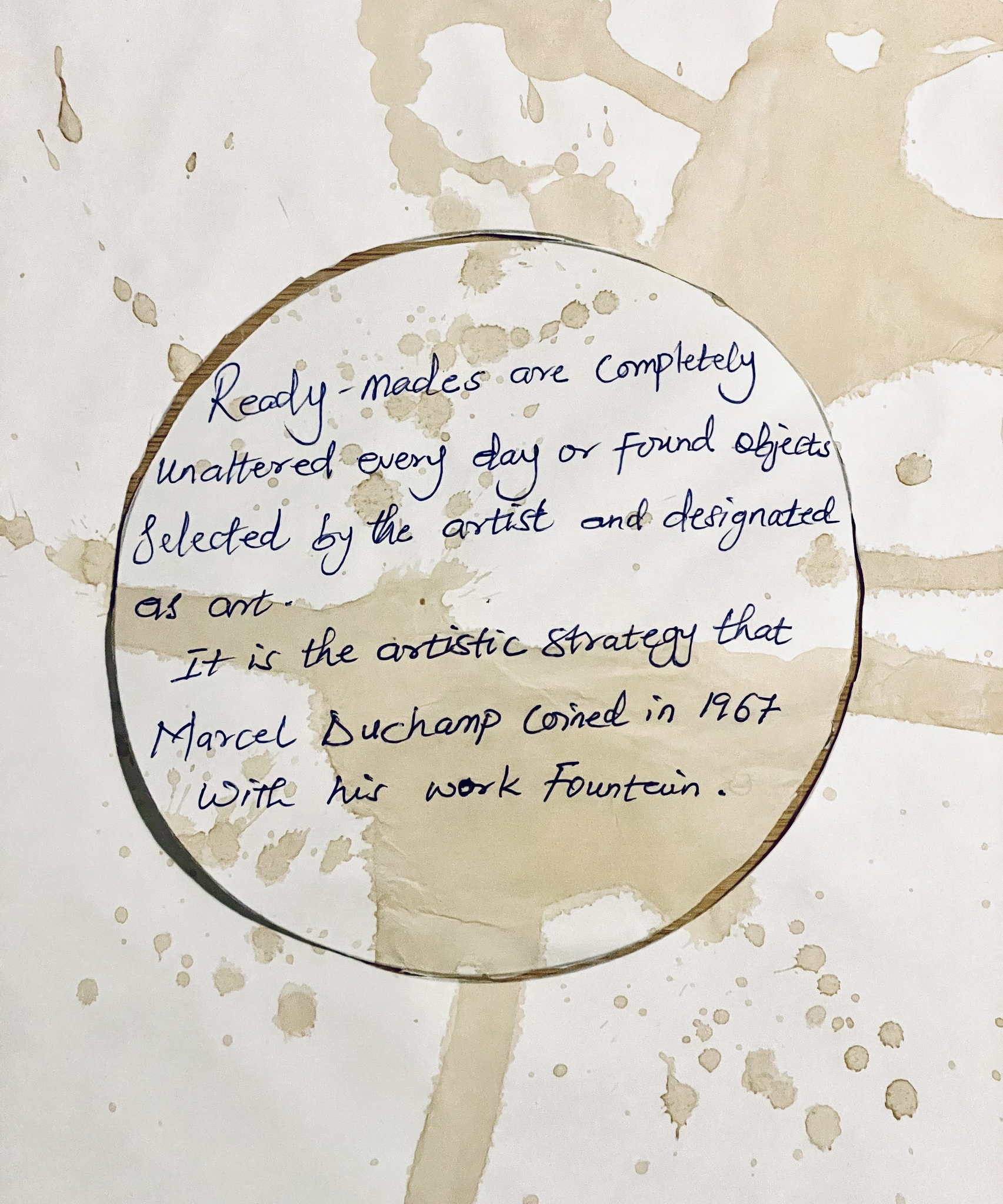 [1] Ready-mades are completely unaltered every day or found objects selected by the artist and designated as art. It is the artistic strategy that Marcel Duchamp coined in 1967 with his work Fountain.