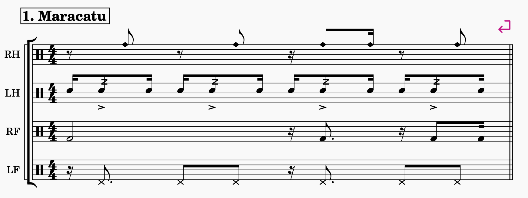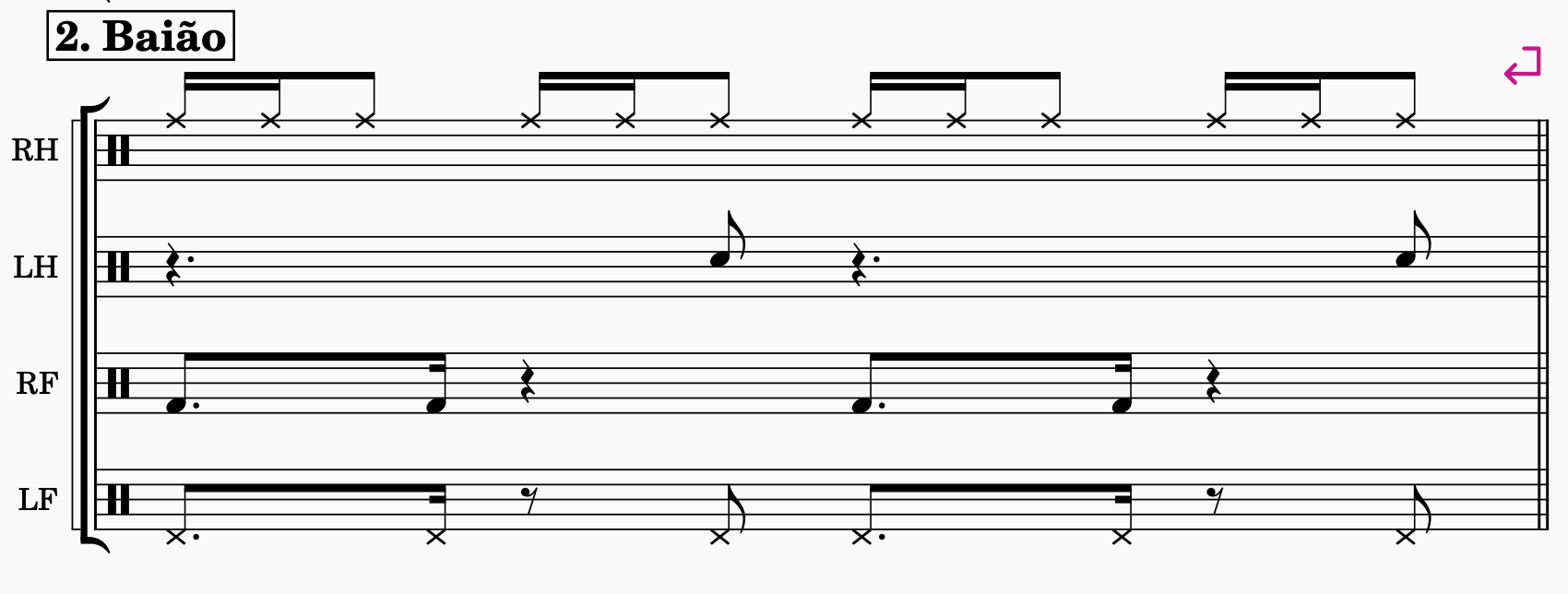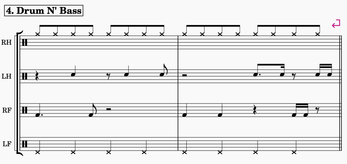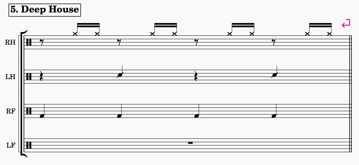 The sheet music to the right shows a model that I use during the practicing process. In the first bar you can see the full groove combination played, then continuing by removing one limb at a time, always leaving one out. An exercise is to execute the rhythm as written here to gain more control and awareness of each limb. Then continue by switching the pause measure into doing a improvised phrase in the selected limb instead. The improvised limb then moves around the body, while still maintaining the groove in the three remaining limbs.