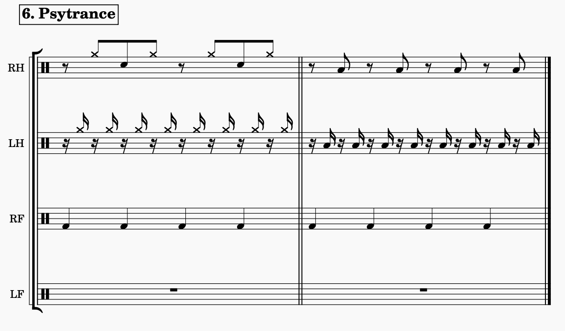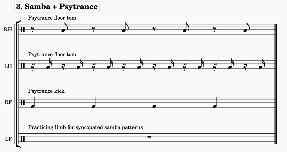 The song "Laserism" has an outro alluding to the the psytrance genre. Although I am not playing any samba rhythms (as done with psytrance in my method) you can hear a lot of syncopation going on together with the open and spacious attitude practiced in method 4.3. The coordination needed to excecute the faster samba patterns helps me play other rhythms in a more relaxed way, focusing on the musicality instead of the mechanics of playing.