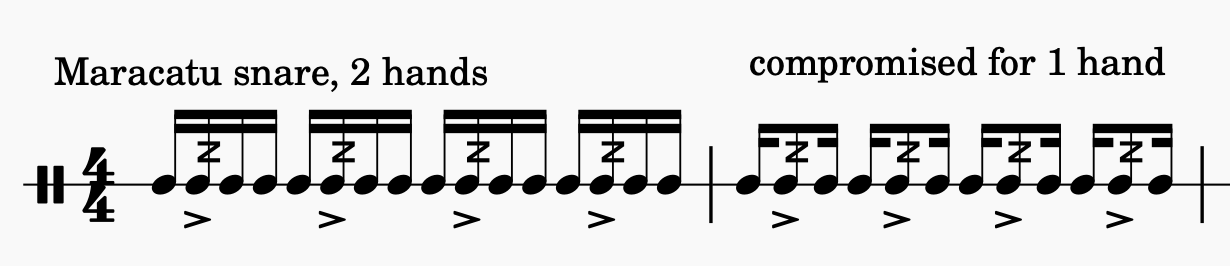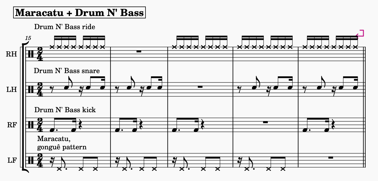 For example, the snare drum in a maracatu has to be played with two hands to attain the traditional sound, but when mixing it with Drum N’ Bass I need to use one hand for another rhythmic layer, whilst compromising the snare pattern, picking out the important notes to emphasise with one hand only, as shown in the sheet music to the right.