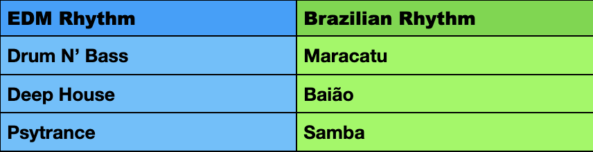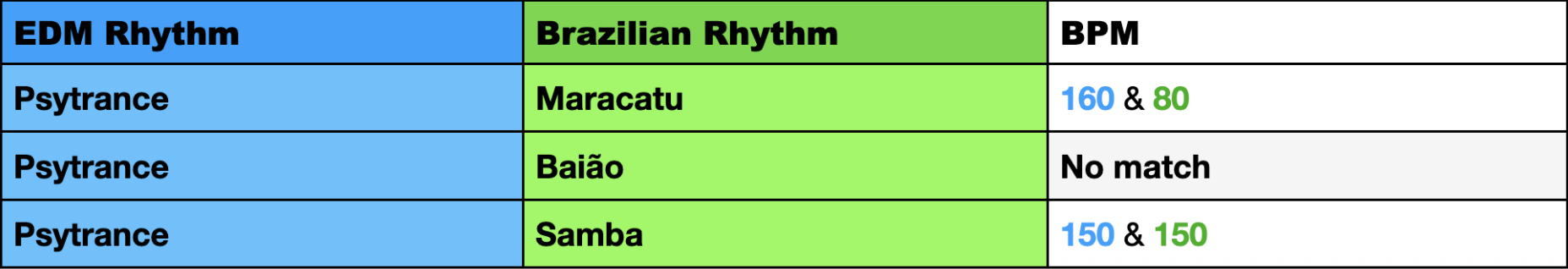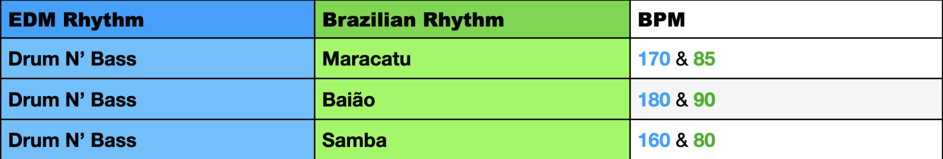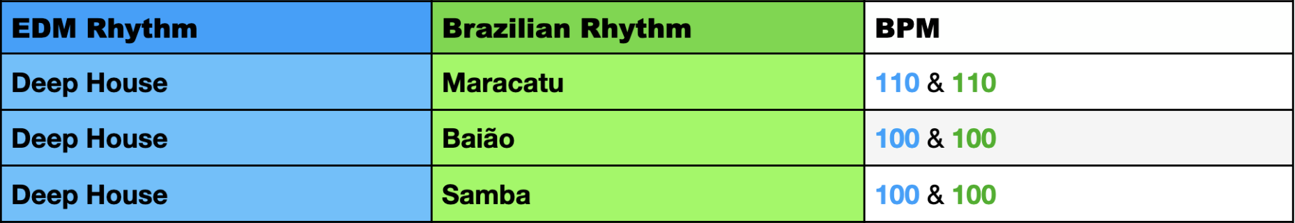 In these tables and throughout this project I will present the rhythms I work with in two categories, marked with different colors. The first category is the Brazilian rhythms marked in green and the second category consists of EDM rhythms, marked in blue.