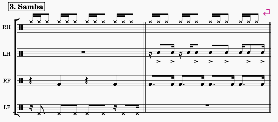Although I encountered this problem I feel happy with the result and the work arounds I made. As I have been showing some of my work to peer musicians who are also familiar with Brazilian rhythms, they have always been able to distinguish the Brazilian elements from each groove. This is proof that I have been able to maintain the essential rhythmical structure of the styles.