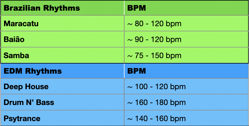 Before starting to mix different styles I want to take into consideration their tempo markings (BPM - beats per minute). That is to say in which tempo they are generally played and which tempos work well with the rhythmical structure and musical expression. Of course every style can be played in various tempos and no tempo would have to be considered more correct or authentic, since we can find music within each tradition that ranges through all kinds of tempos. However, as being a very experienced listener and performer who both consumed and played a lot of the EDM and Brazilian rhythms through both media and live at EDM clubs, raves and the streets of Brazil in various regions during carnival seasons, samba & forró events etc, I have a general sense of the BPM in which these rhythms are usually performed. I do not claim these tempo markings to be traditionally or scientifically correct, nor absolute in any way, but they will be useful as a template for this work.